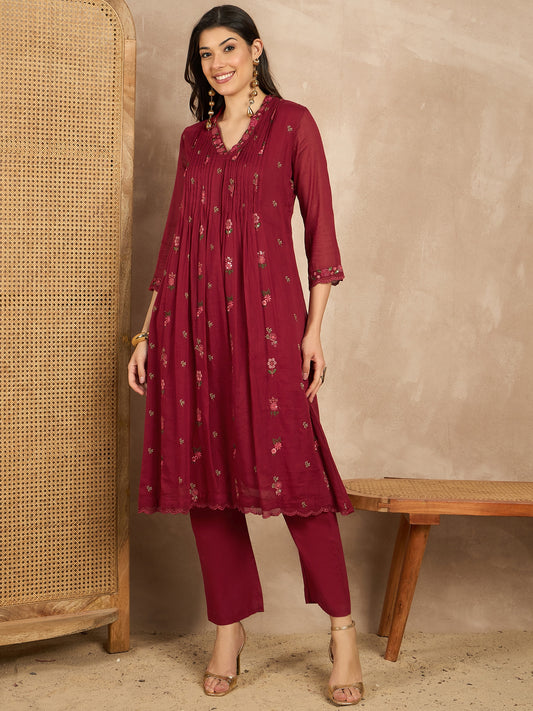 Women Floral Embroidered Pleated Thread Work Kurta with Trousers & With Dupatta