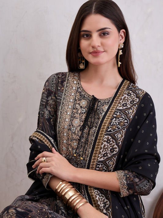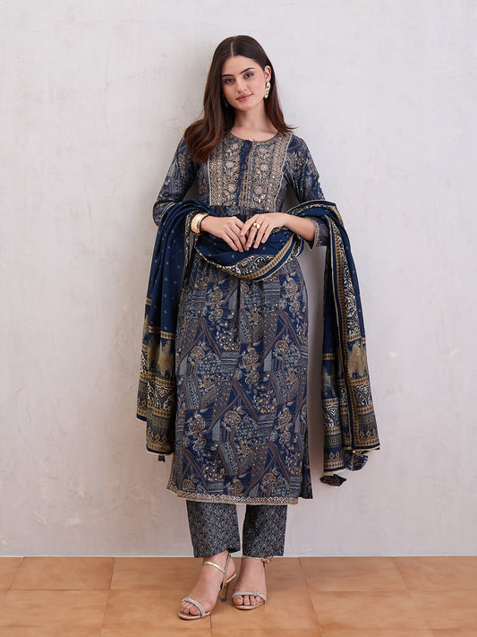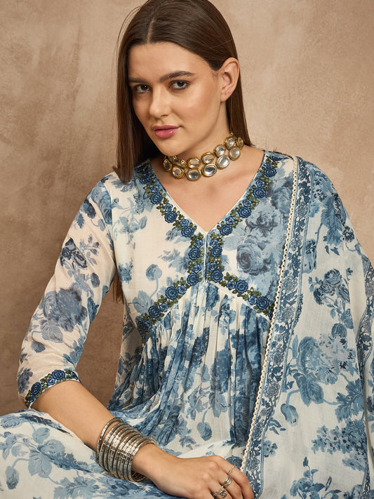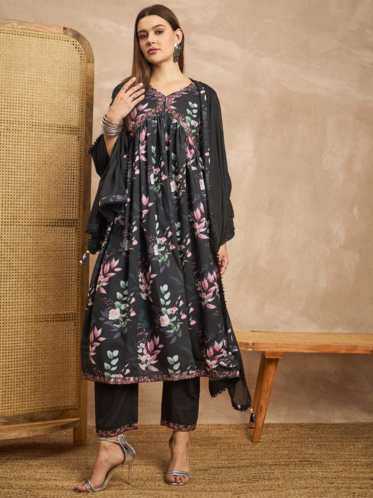 Floral Printed Empire Sequinned Anarkali Kurta with Trousers & Dupatta
