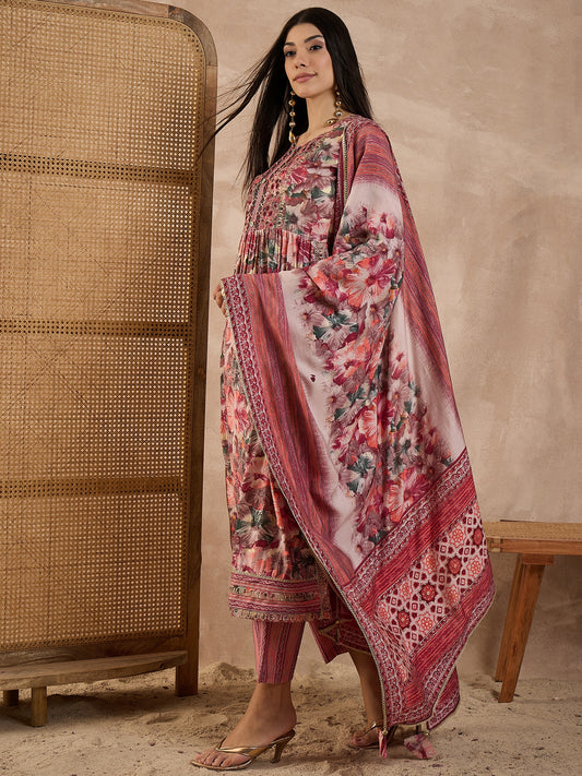 Floral Printed Pleated Sequinned Anarkali Kurta with Trousers & Dupatta