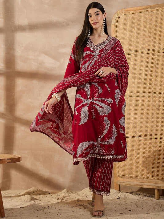 Bandhani Printed V-Neck Beads and Stones Pure Cotton Kurta With Trousers & Dupatta
