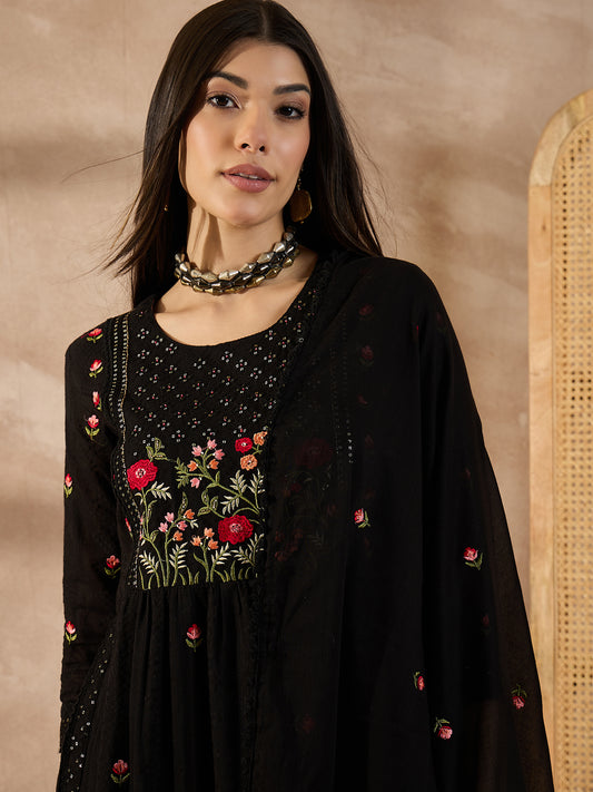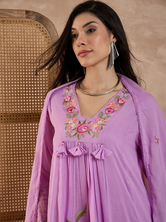 Floral Embroidered Round Neck Pure Cotton Anarkali Kurta with Trouser & Dupatta