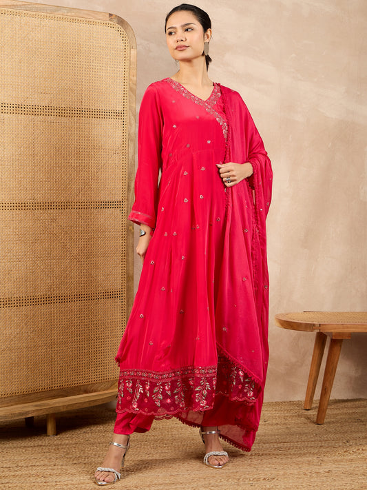 Women Floral Embroidered Angrakha Beads and Stones Silk Crepe Kurta with Trousers & With Dupatta