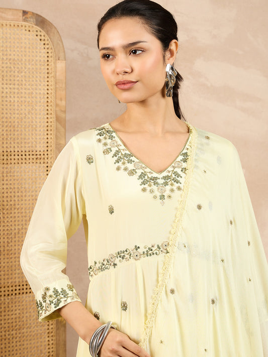 Women Floral Embroidered Empire Beads and Stones Silk Crepe Kurta with Trousers & With Dupatta