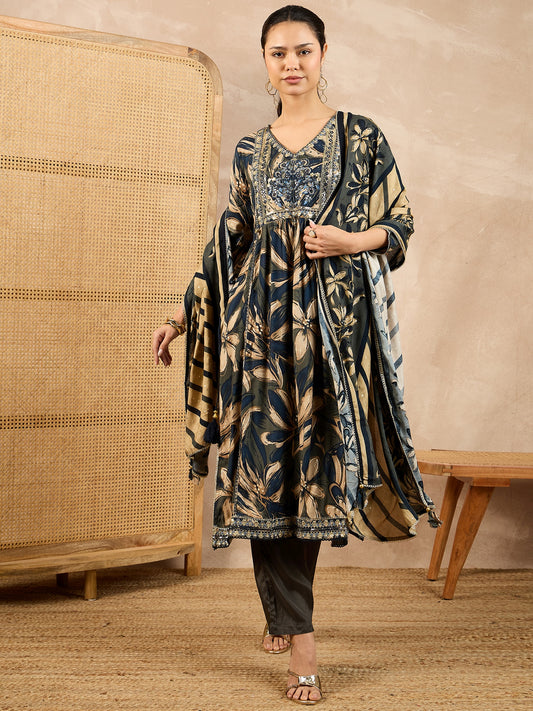 Women Floral Embroidered Anarkali Kurta with Trousers & Dupatta