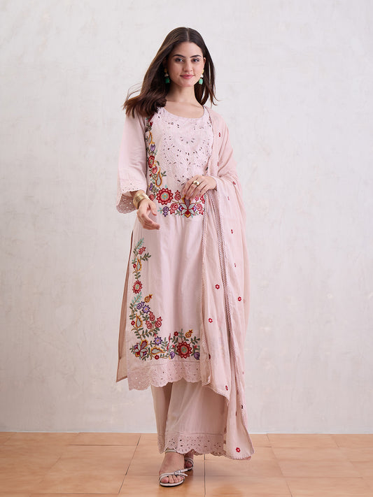 Women Floral Embroidered Cotton Kurta with Trousers & Dupatta