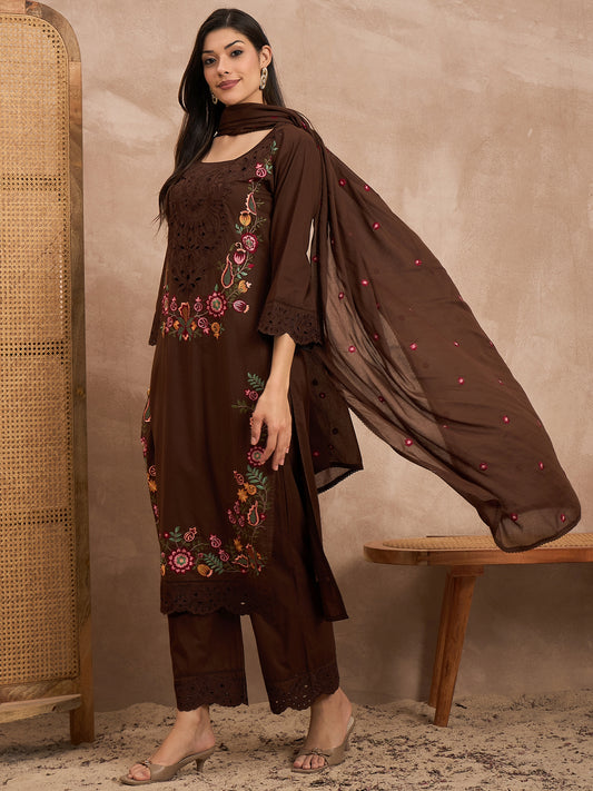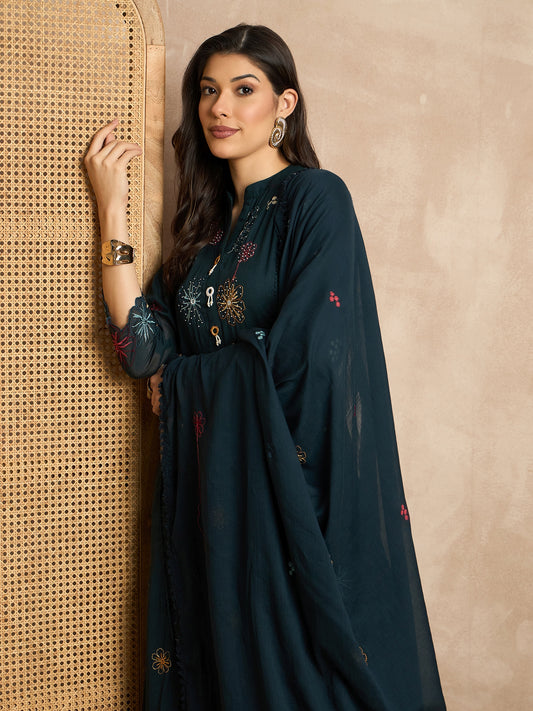 Women Floral Embroidered Pure Cotton A-Line Kurta with Trousers & Dupatta