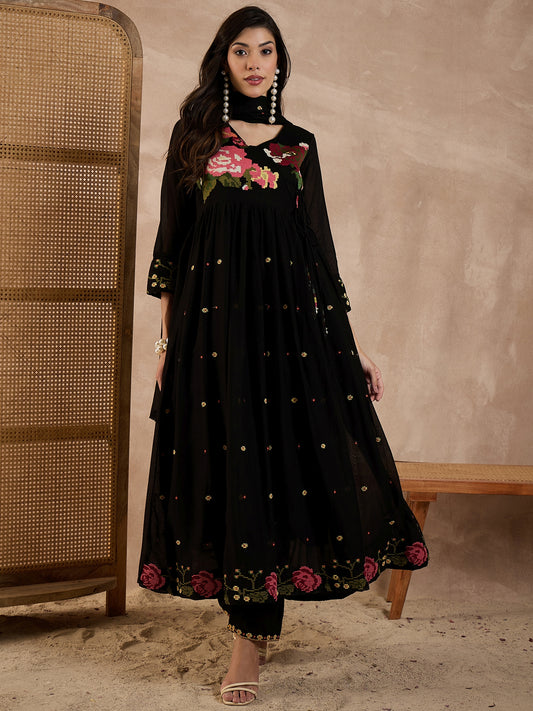 Women Floral Embroidered Pleated Voile Anarkali Kurta with Trouser & Dupatta