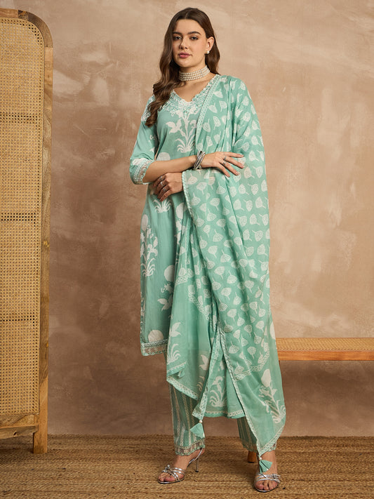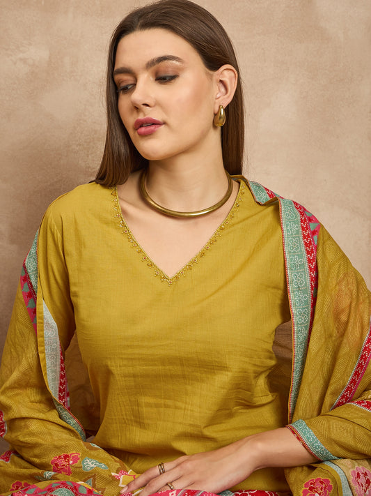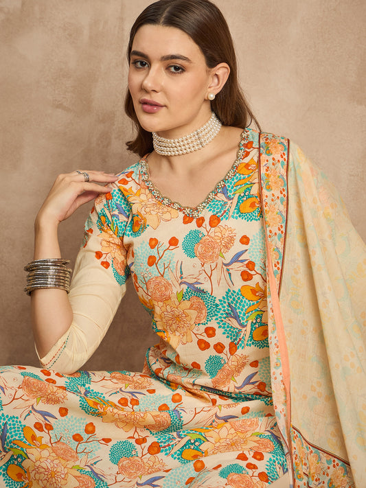 Women Floral Printed Beads and Stones Pure Cotton Kurta with Trousers & Dupatta