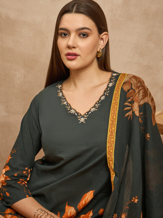 Women Floral Embroidered Thread Work Straight Kurta with Trouser & Dupatta