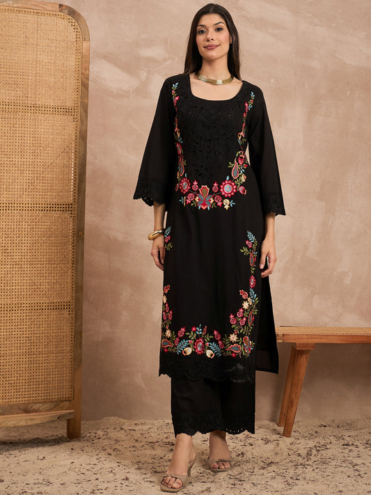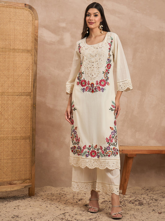 Women Floral Embroidered Thread Work Straight Kurta with Palazzos & Dupatta