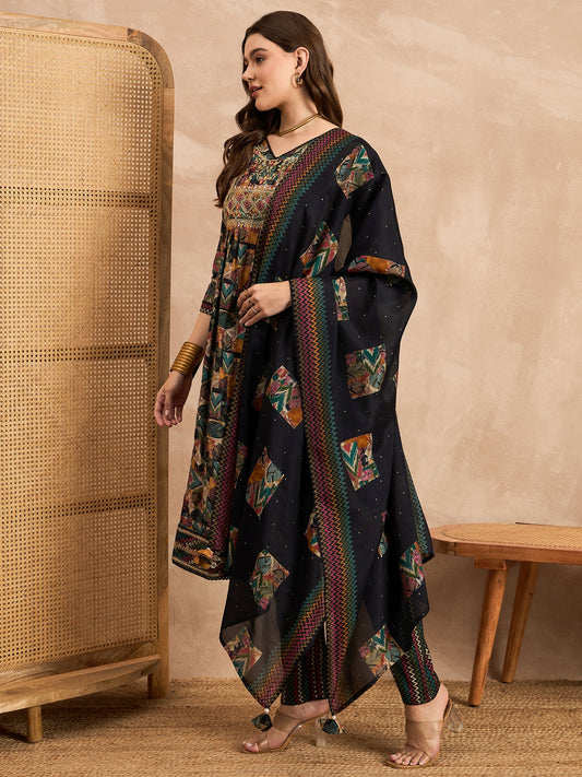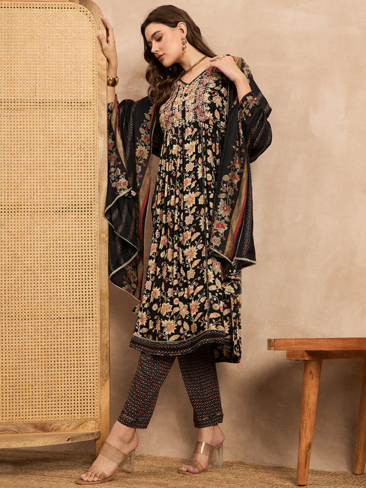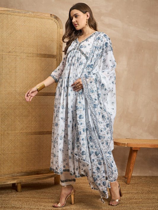 Floral Printed V-Neck Thread Work Empire Anarkali Kurta With Trousers & Dupatta