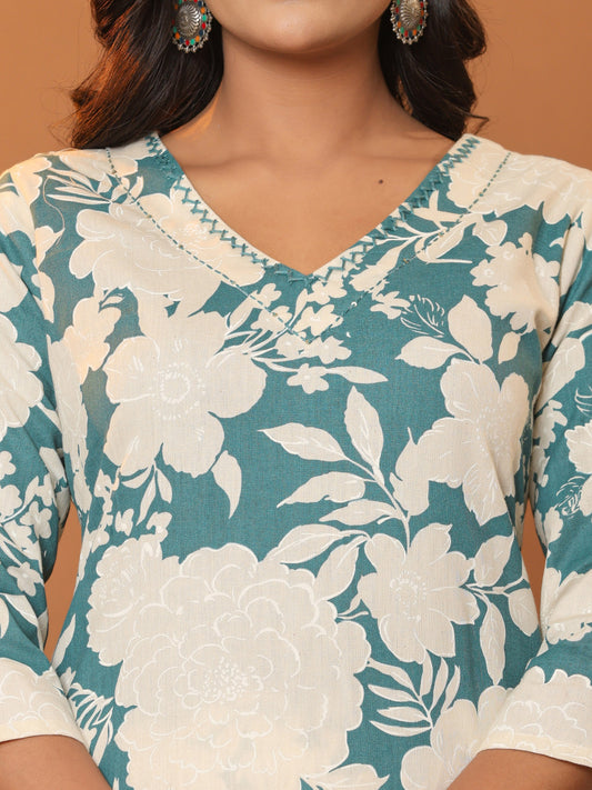 Floral Printed V-Neck Thread Work Pleated A-Line Kurta With Trousers & Dupatta