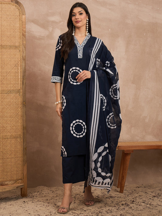 Geometric Printed V-Neck Sequinned Pure Cotton Kurta With Trousers & Dupatta