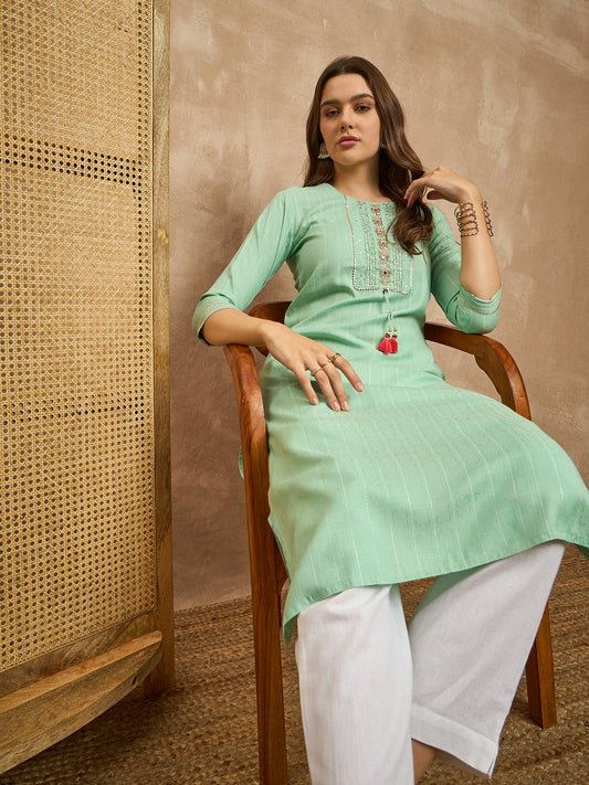Striped Embroidered Mirror Work Straight Kurta