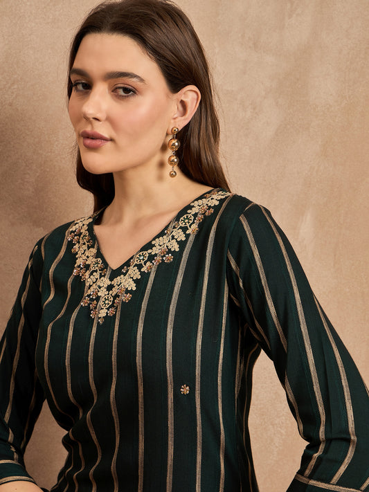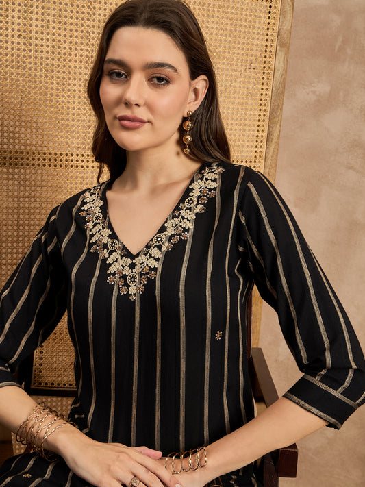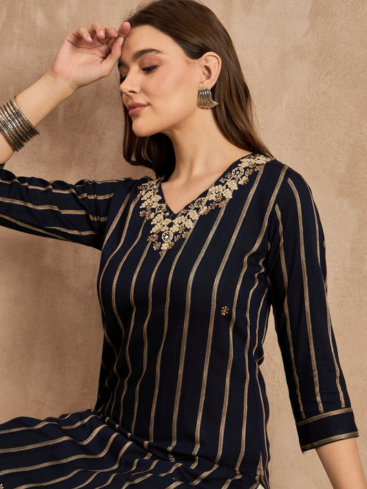 Striped V-Neck Thread Work Straight Kurta