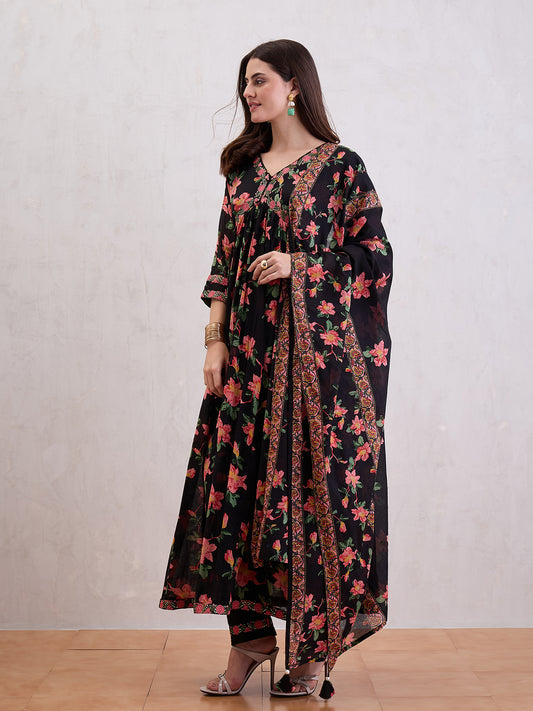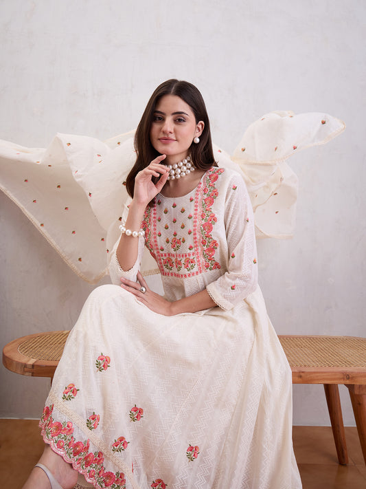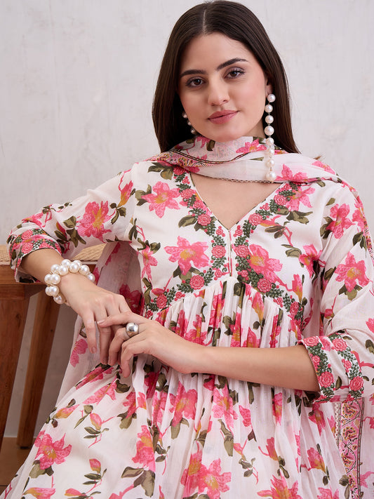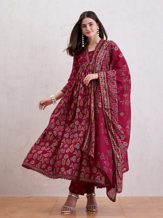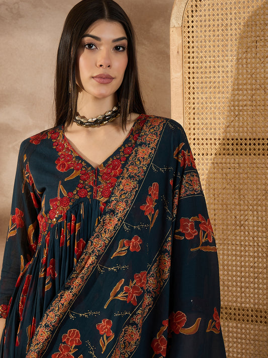 Women Abstract Printed Beads and Stones Anarkali Kurta with Trousers & Dupatta