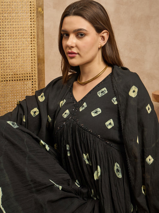 Women Bandhani Printed Beads and Stones Anarkali Kurta with Trousers & Dupatta
