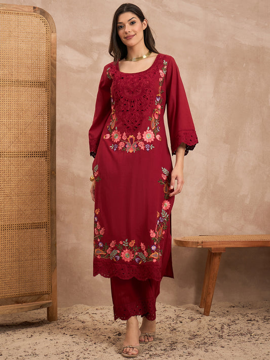 Women Embroidered High Slit Beads and Stones Raw Silk Kurta with Trousers & With Dupatta