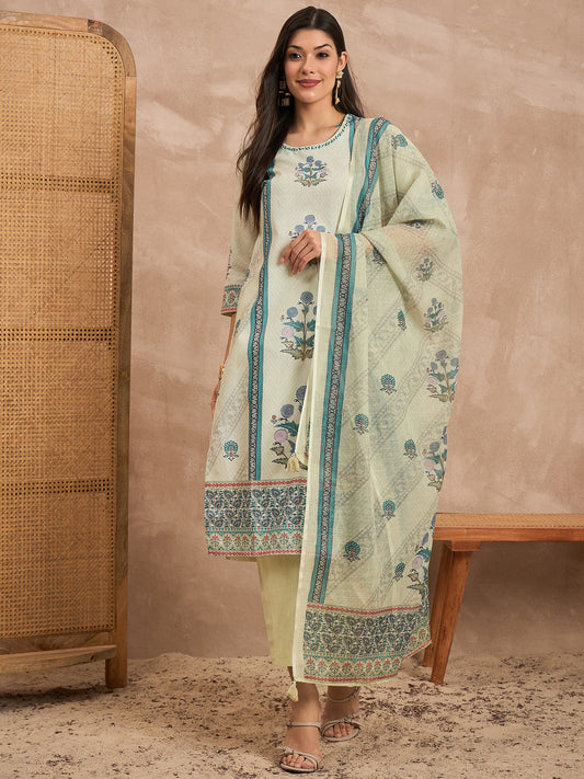 Women Floral Printed Pure Cotton Kurta with Trouser & Dupatta