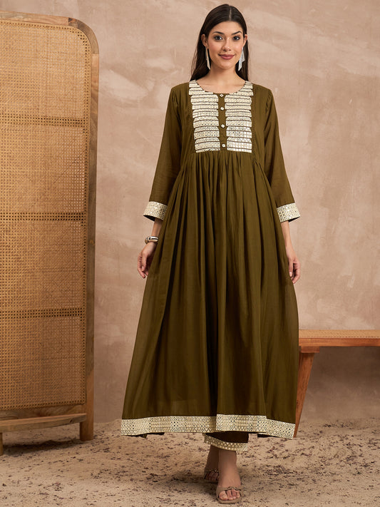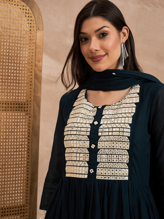 Women Geometric Embroidered Pleated MirrorWork Anarkali Kurta with Trouser & Dupatta