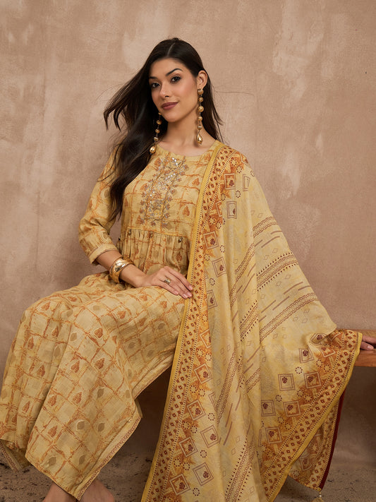 Women Mustard Raw Silk Printed High Slit Kurti Set With Trousers & Dupatta