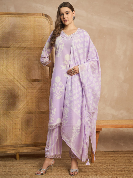 Women Floral Printed Sequinned Pure Cotton Straight Kurta with Trousers & Dupatta