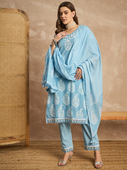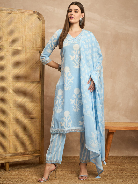 Women Floral Printed Thread Work Pure Cotton Straight Kurta with Trousers & Dupatta