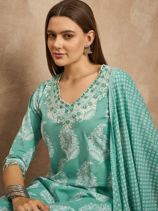 Women Floral Printed Beads and Stones Pure Cotton Kurta with Trousers & Dupatta
