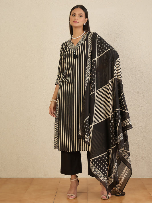 Women Striped Regular Thread Work Pure Cotton Kurta with Trousers & With Dupatta