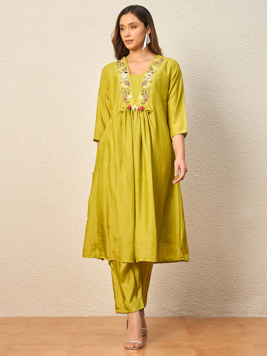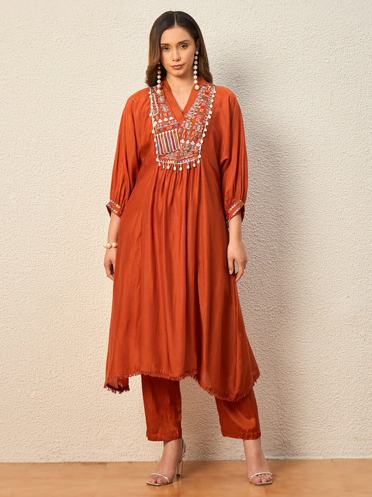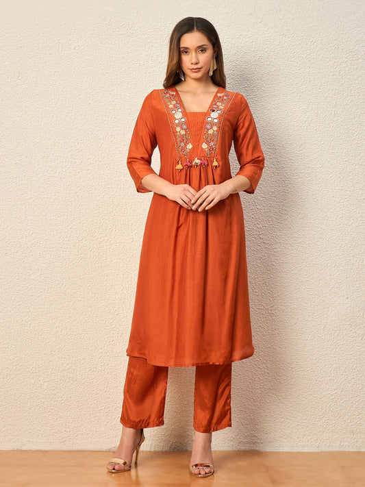 Women Floral Embroidered Empire Mirror Work Raw Silk Kurta with Trousers & With Dupatta