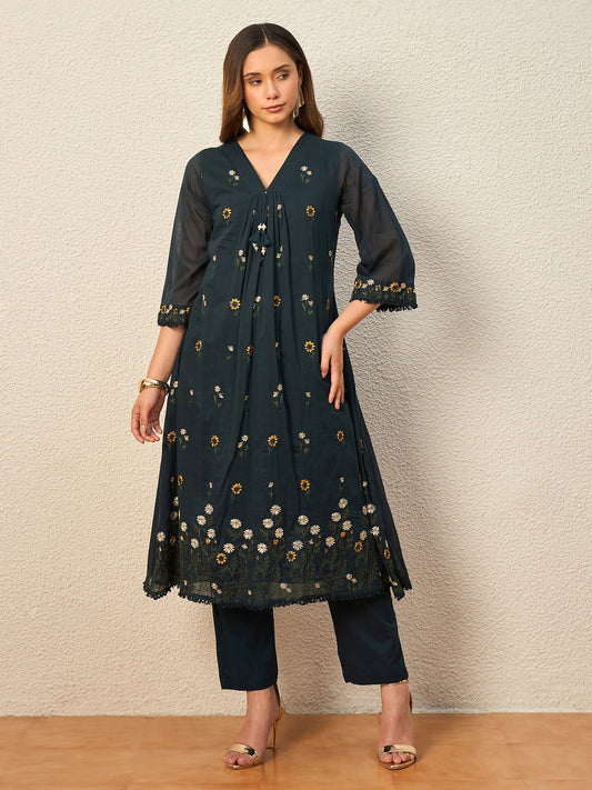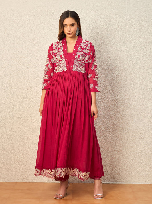 Women Floral Embroidered Empire Thread Work Kurta with Trousers & With Dupatta