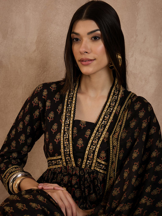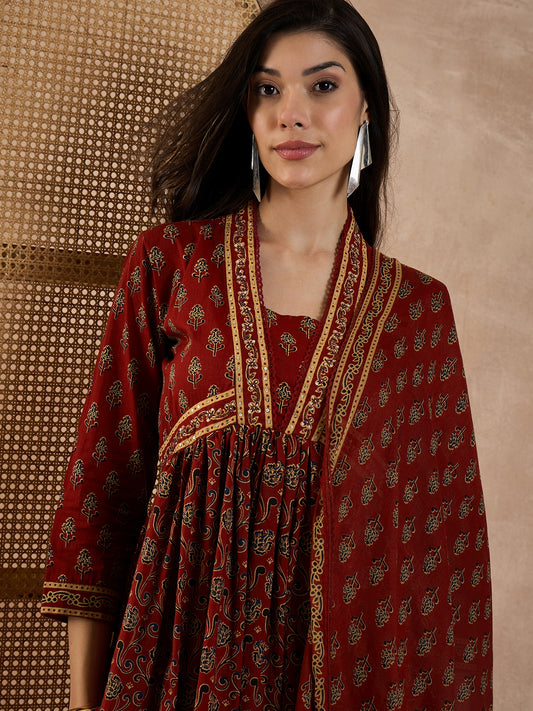 Women Printed Pleated Pure Cotton Anarkali Kurta set with Trousers & Dupatta