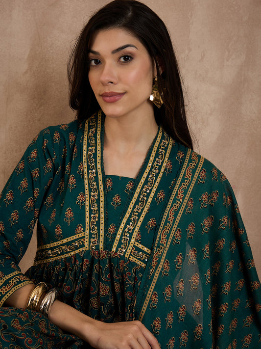 Floral Printed Pleated Sequinned Anarkali Pure Cotton Kurta With Trousers & Dupatta