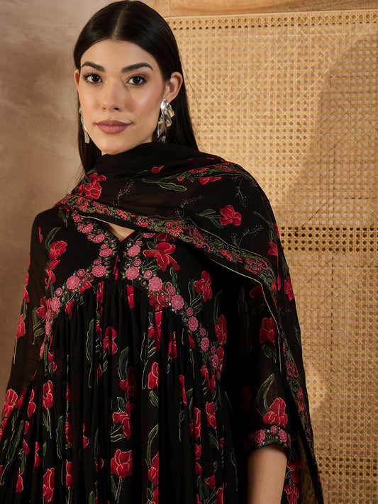 Floral Printed Empire Anarkali Thread Work Voile Kurta With Trousers & Dupatta
