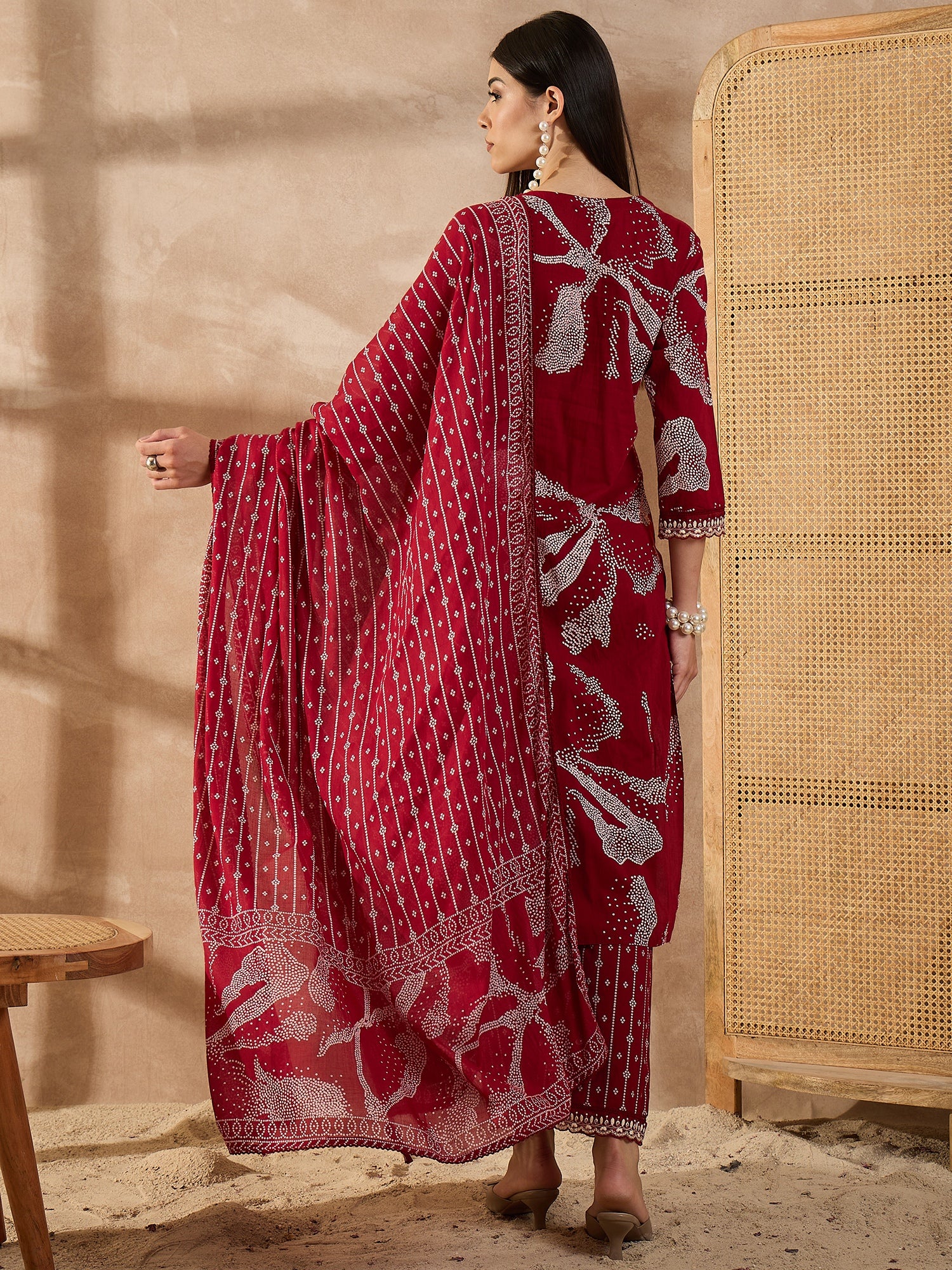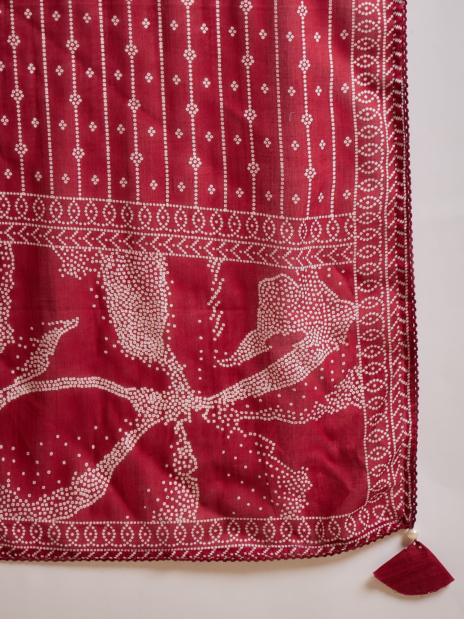 Bandhani Printed Beads and Stones Pure Cotton Kurta With Trousers & Dupatta