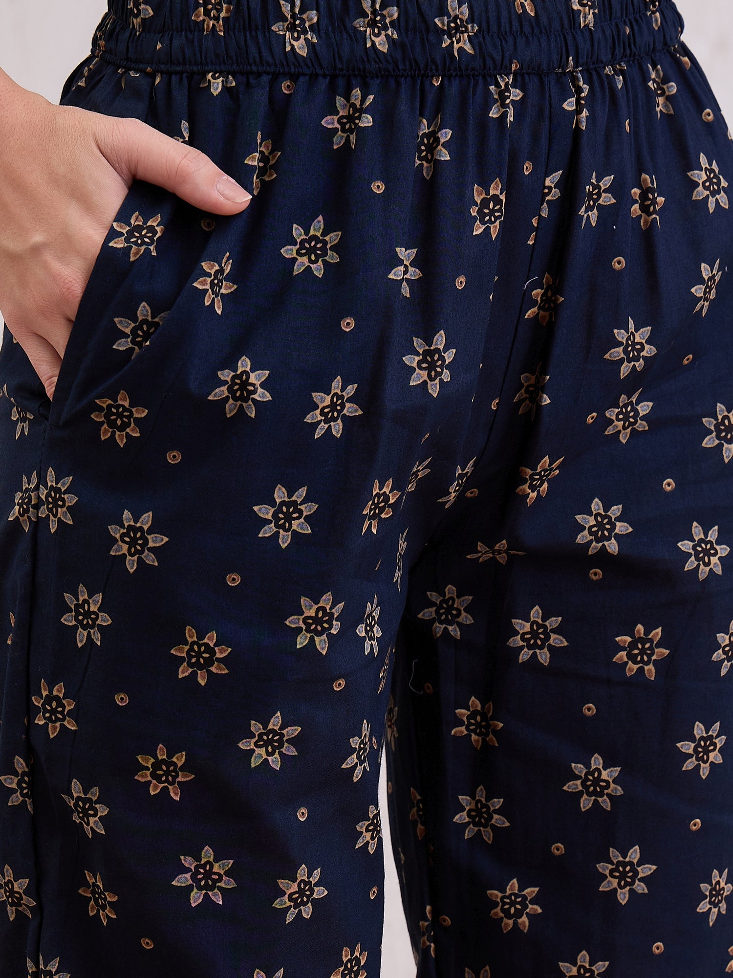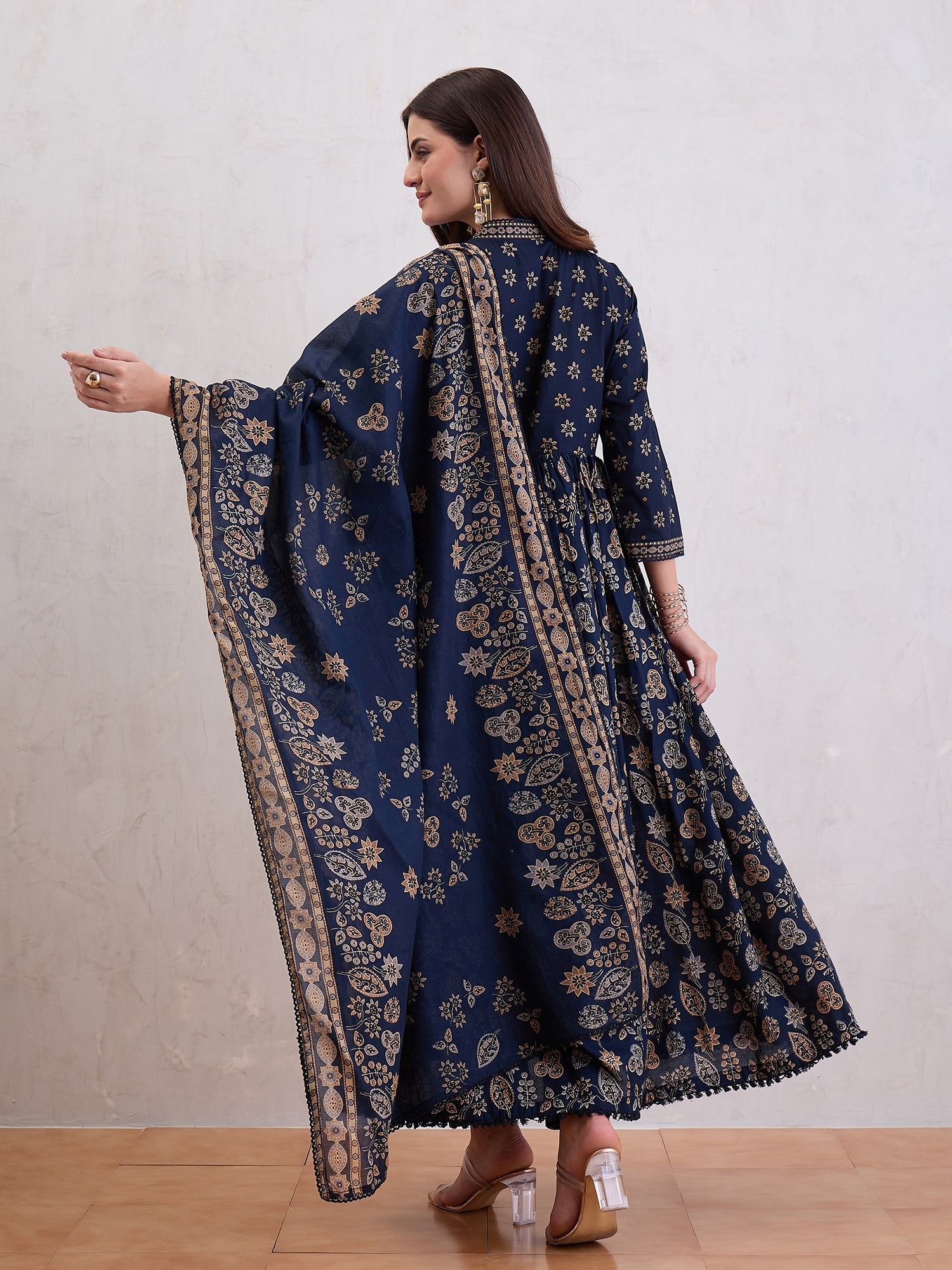 Ethnic Motifs Printed Pleated Mirror Work Pure Cotton Kurta With Sharara & Dupatta