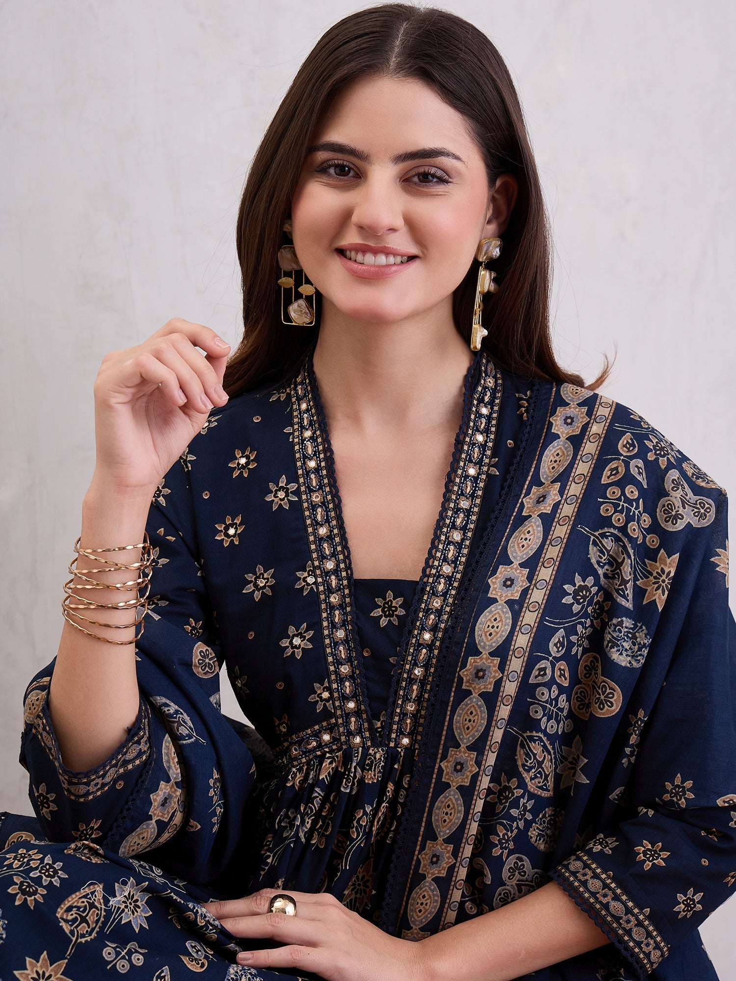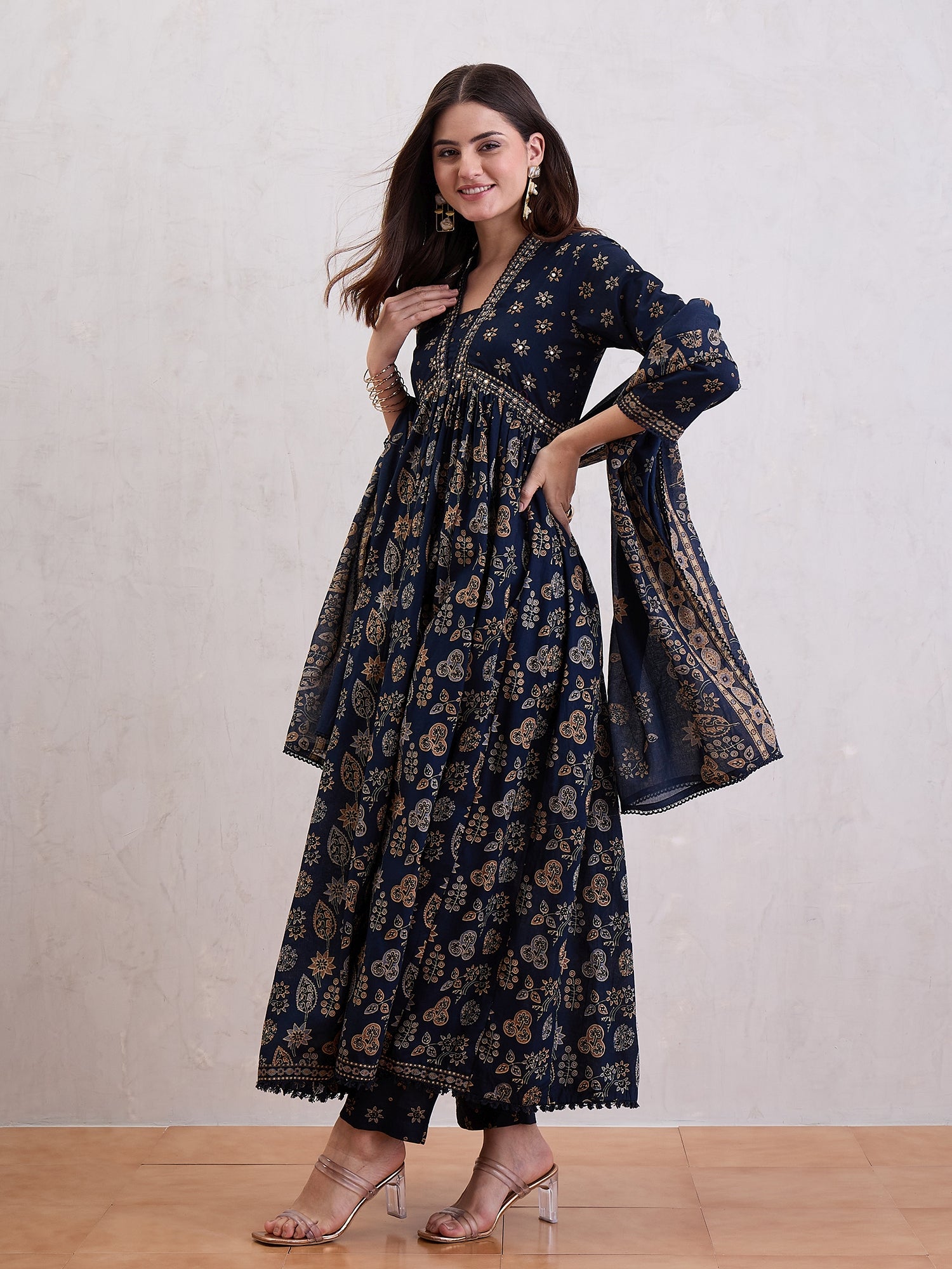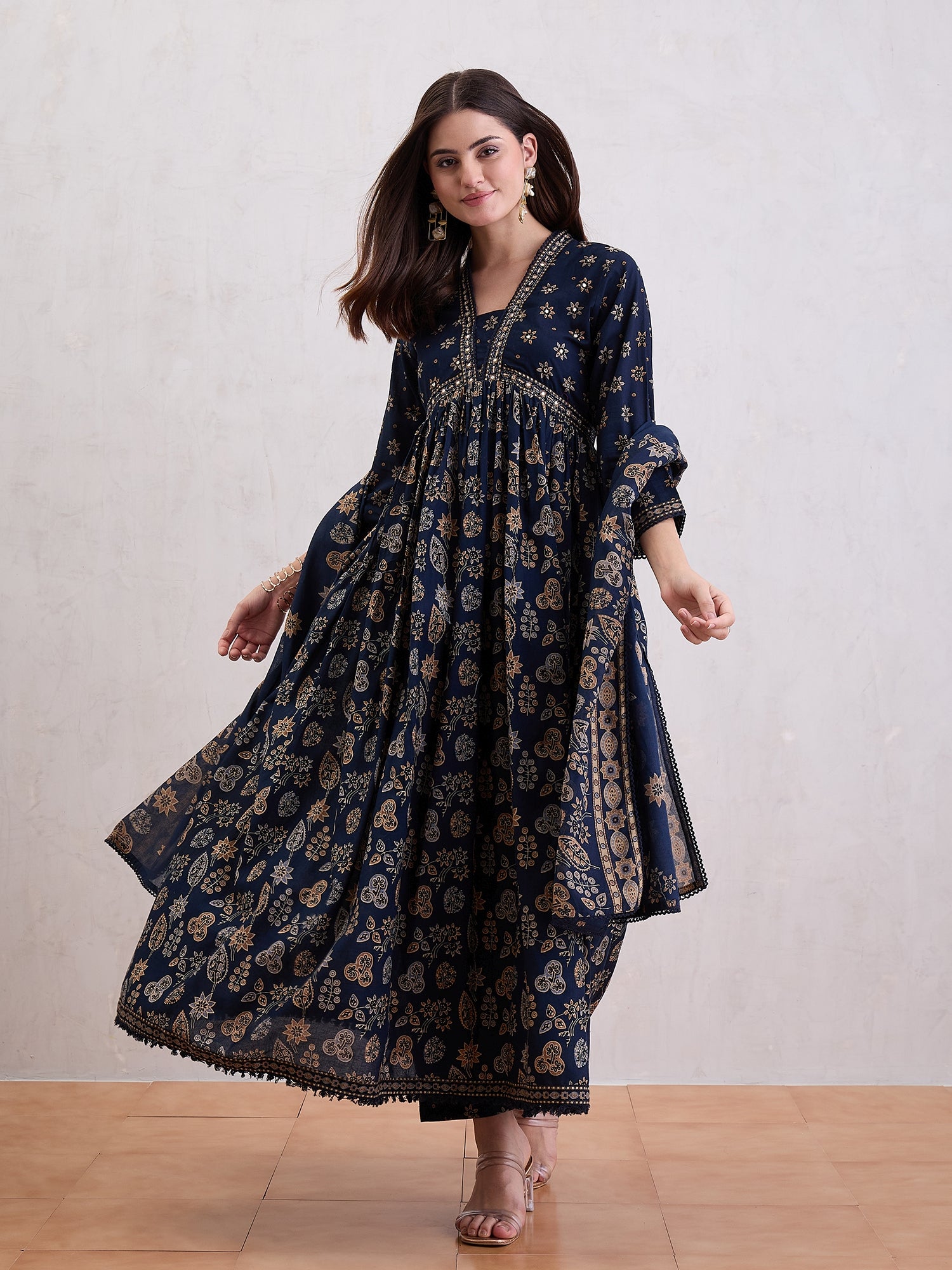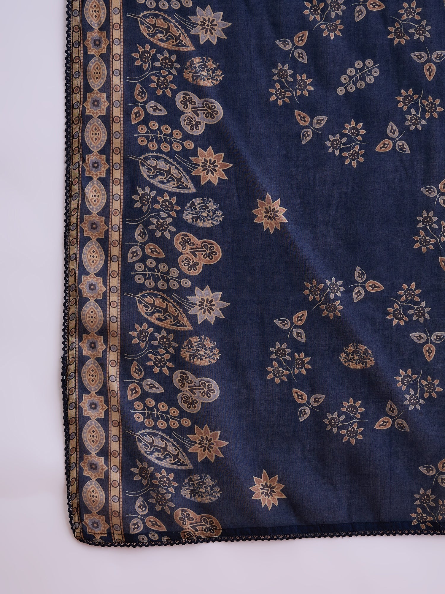 Blue, beige and grey printed Kurta with trouser & dupatta