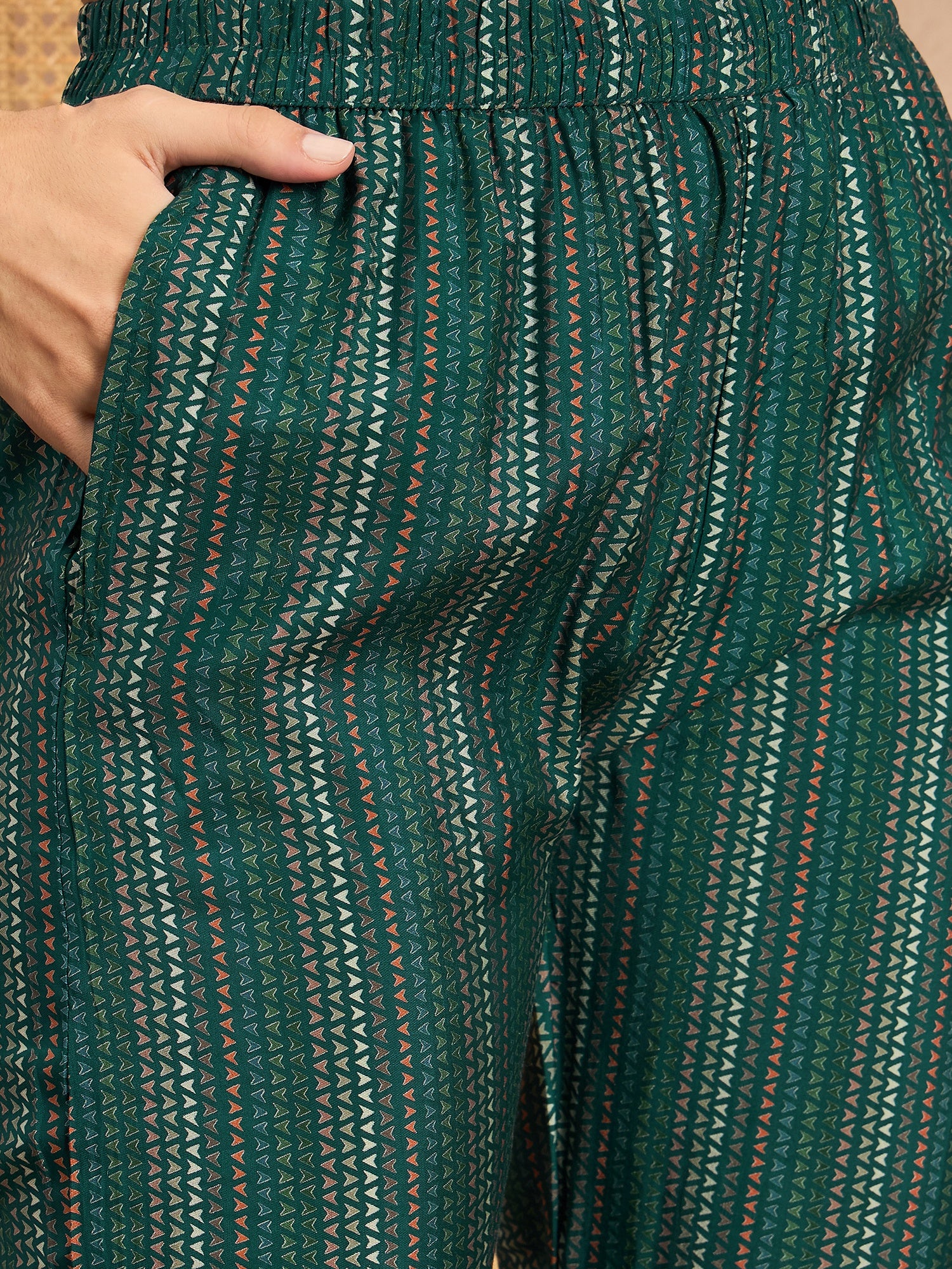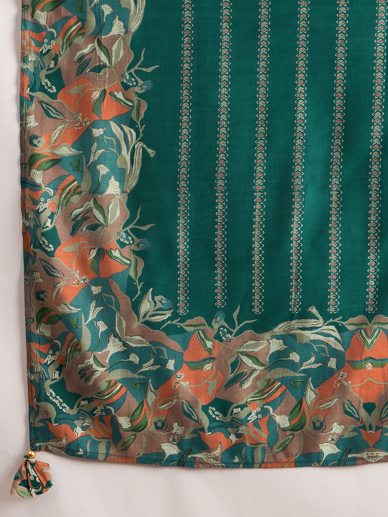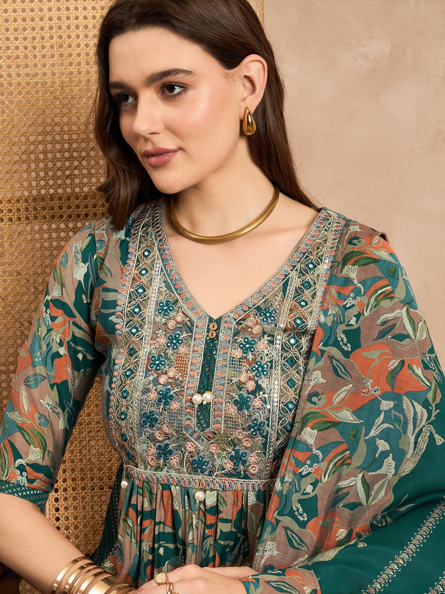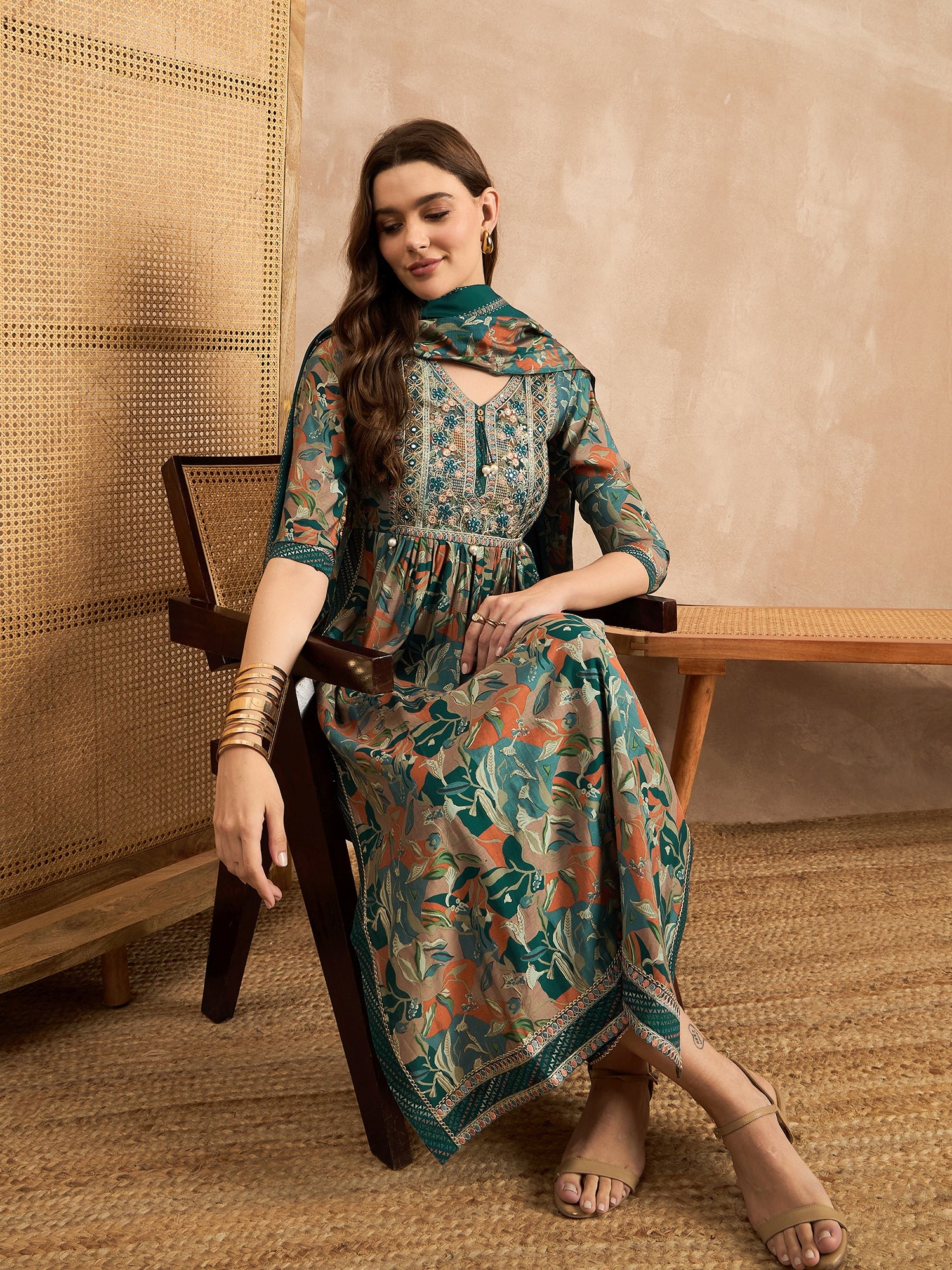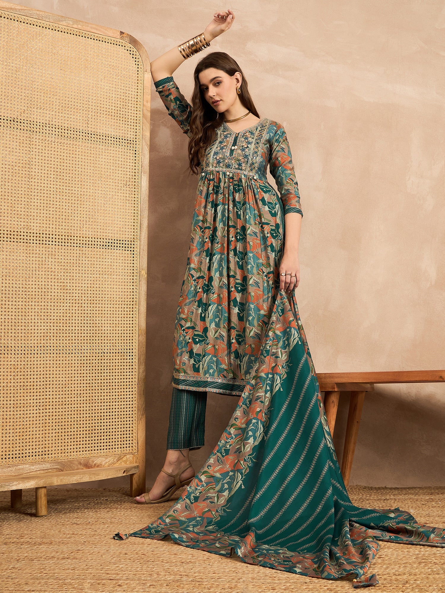 Green,Orange and Grey Embroidered Kurta with Trousers & Dupatta