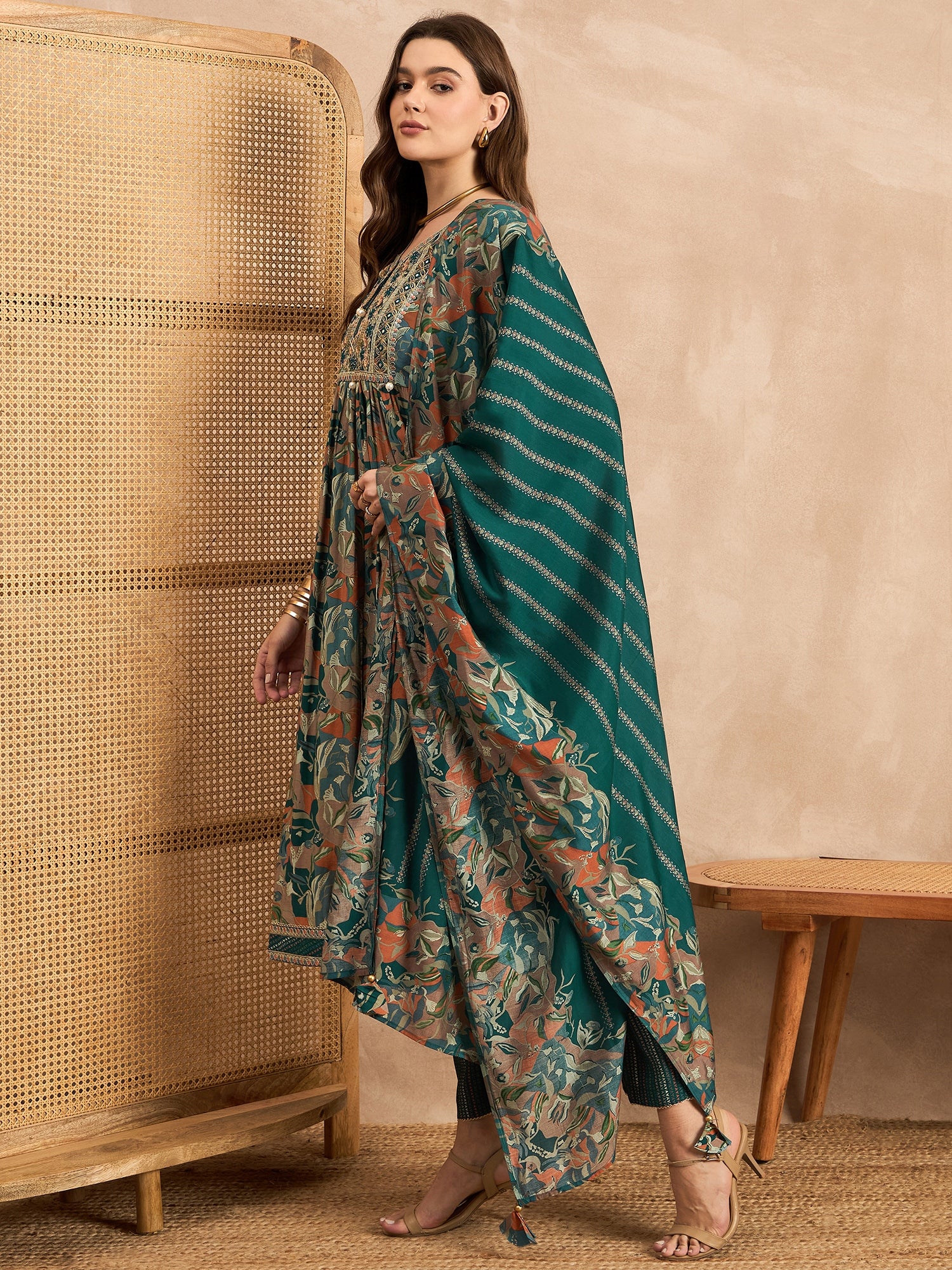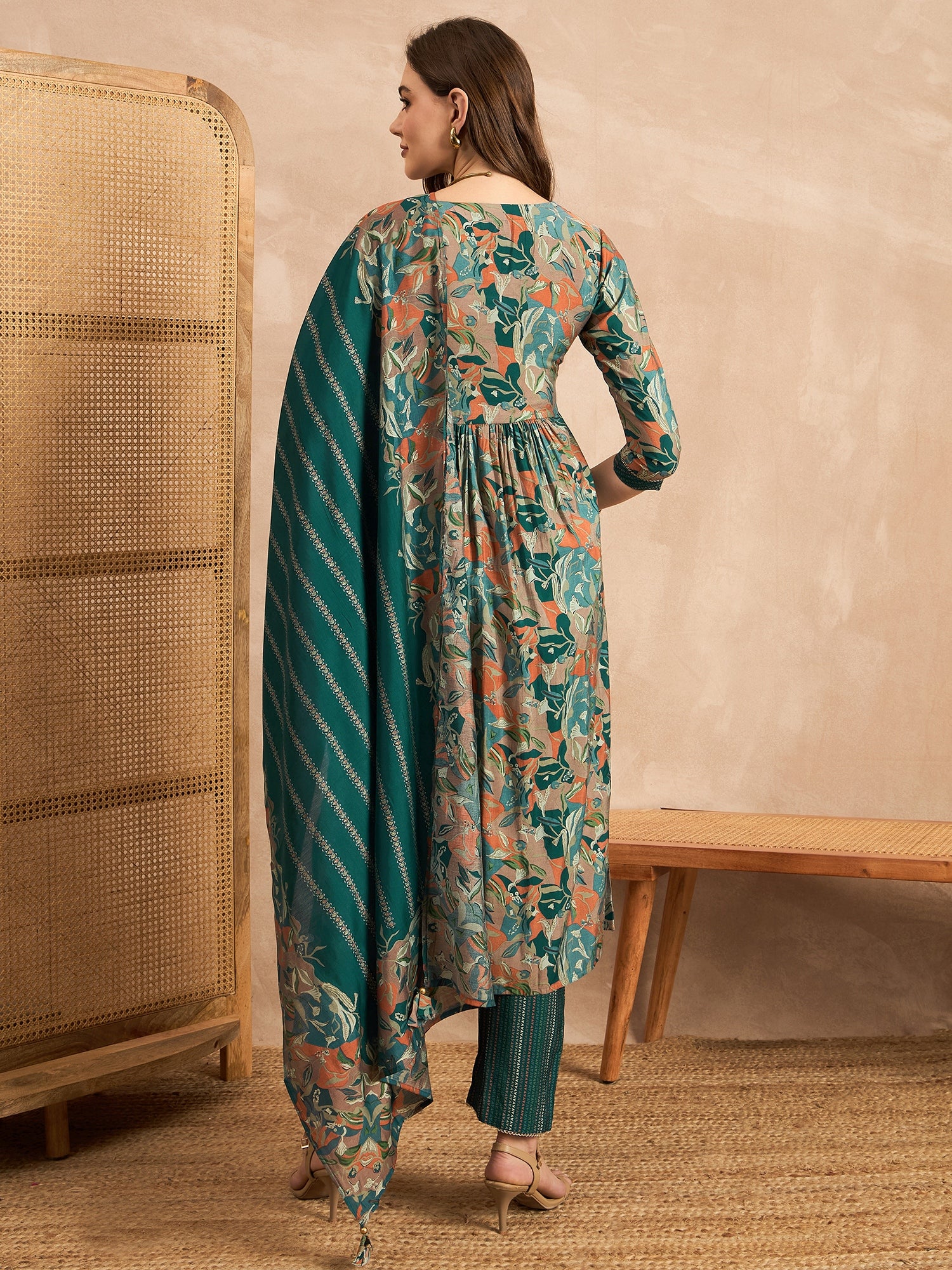 Floral Embroidered Pleated Chanderi Silk A-Line Kurta with Trousers & Dupatta