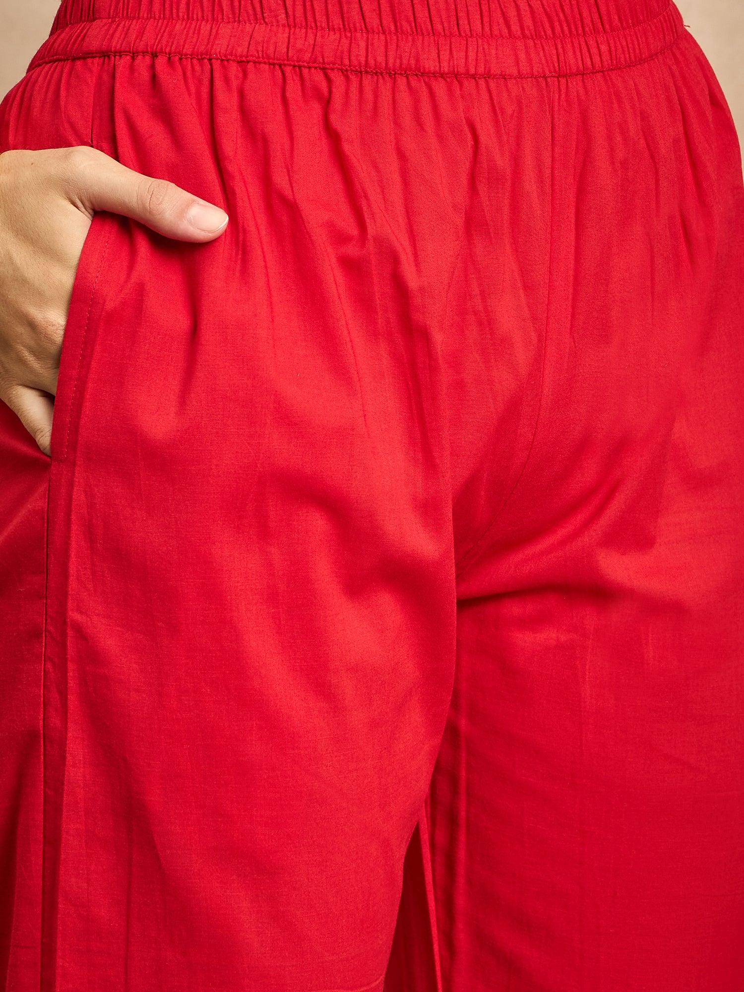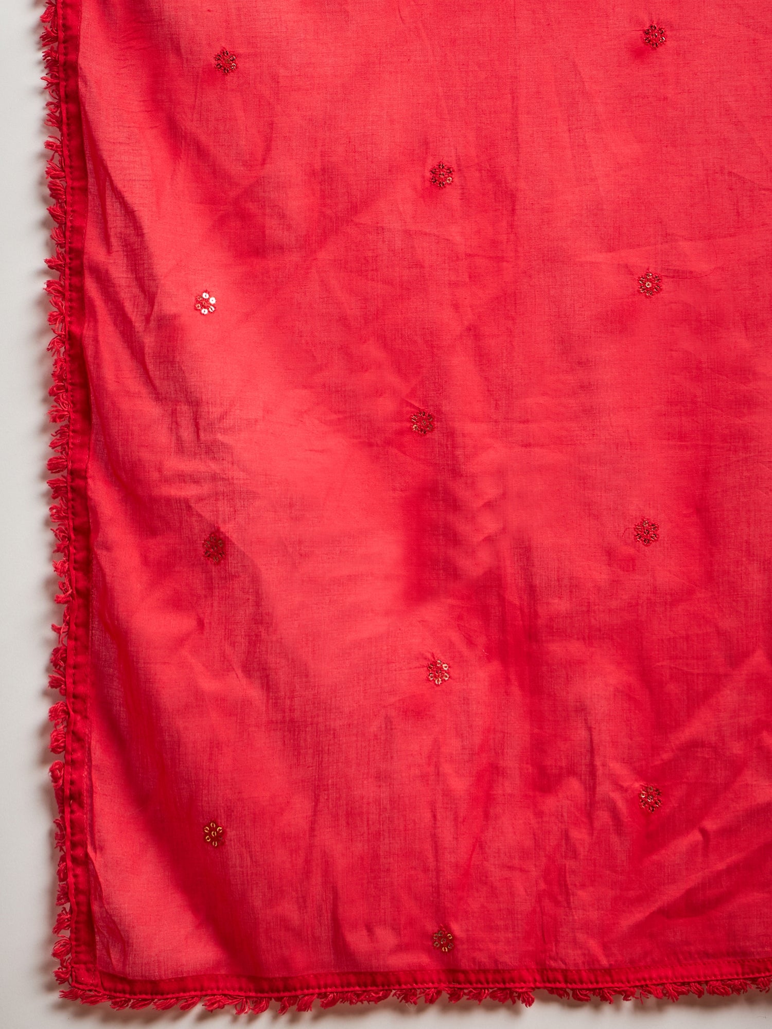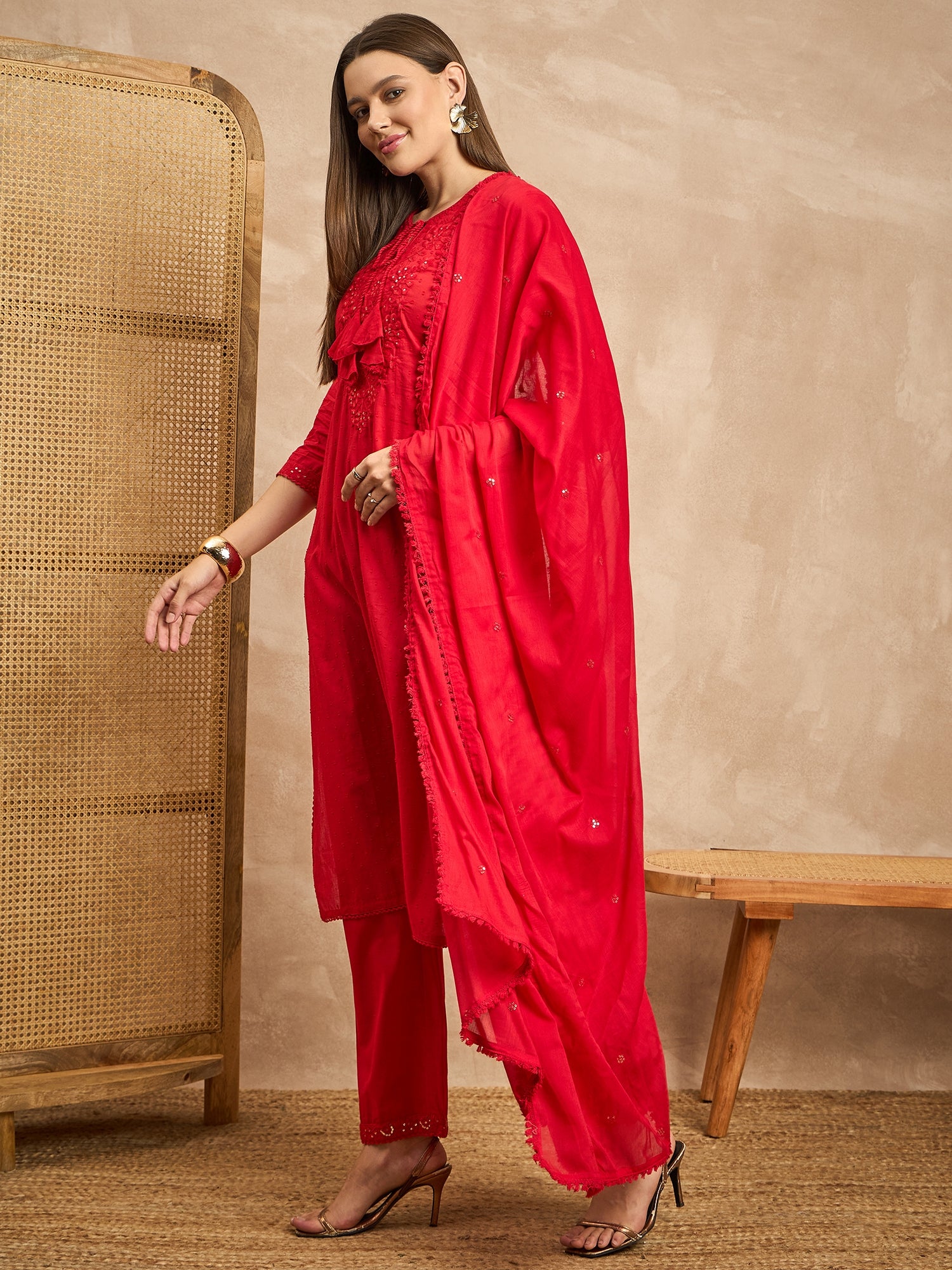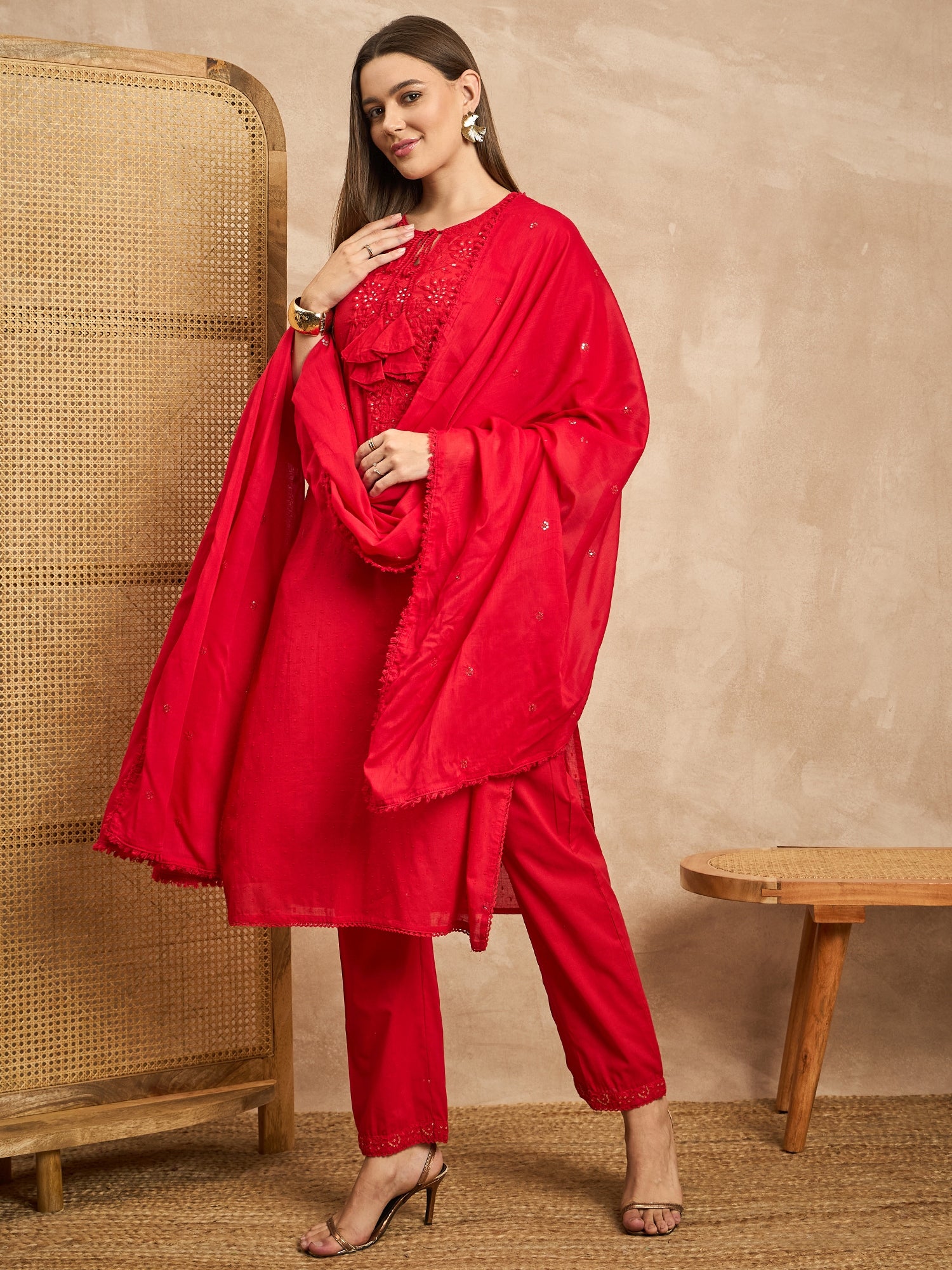 Red and silver-toned embroidered kurta with trousers and dupatta