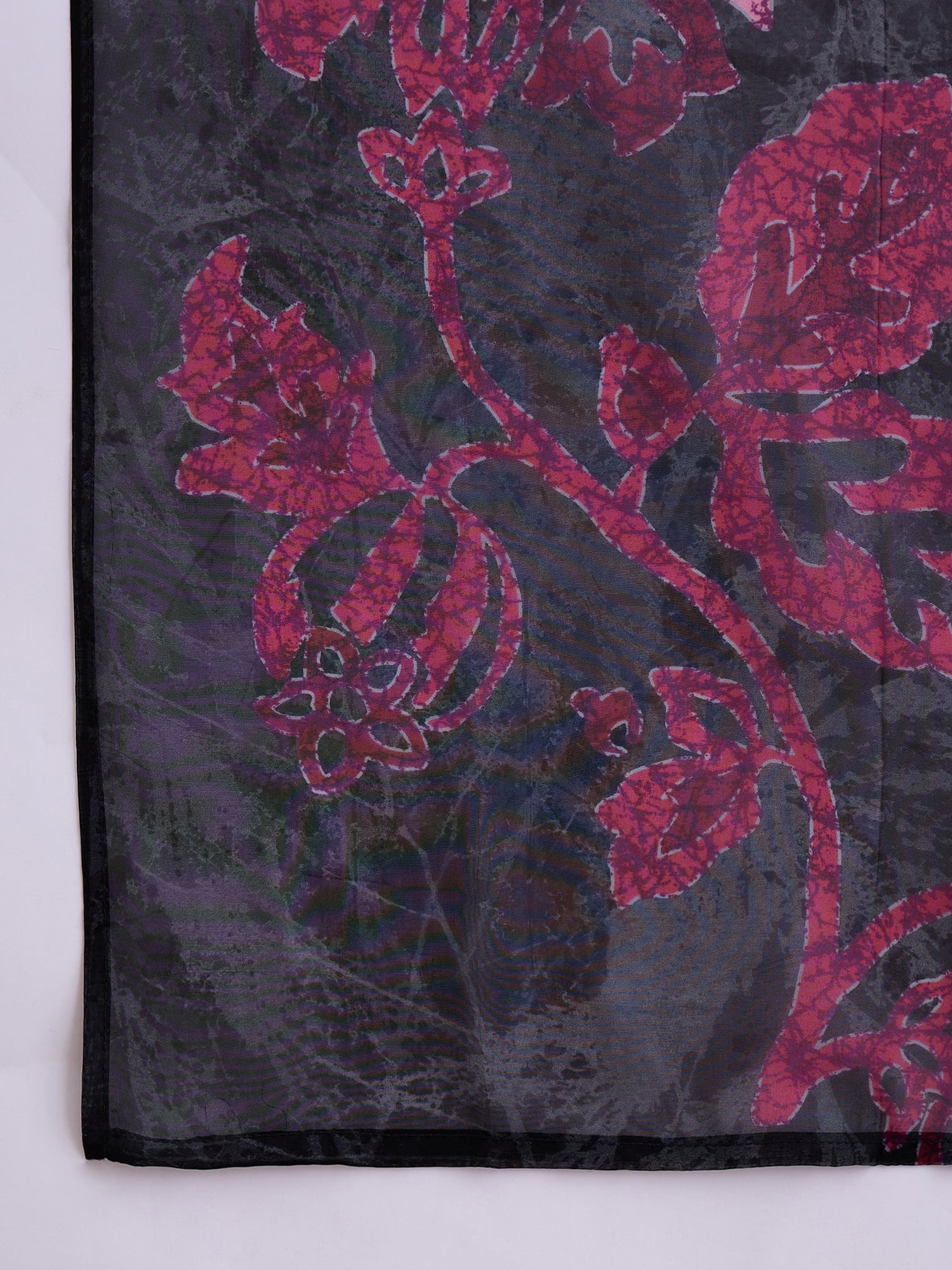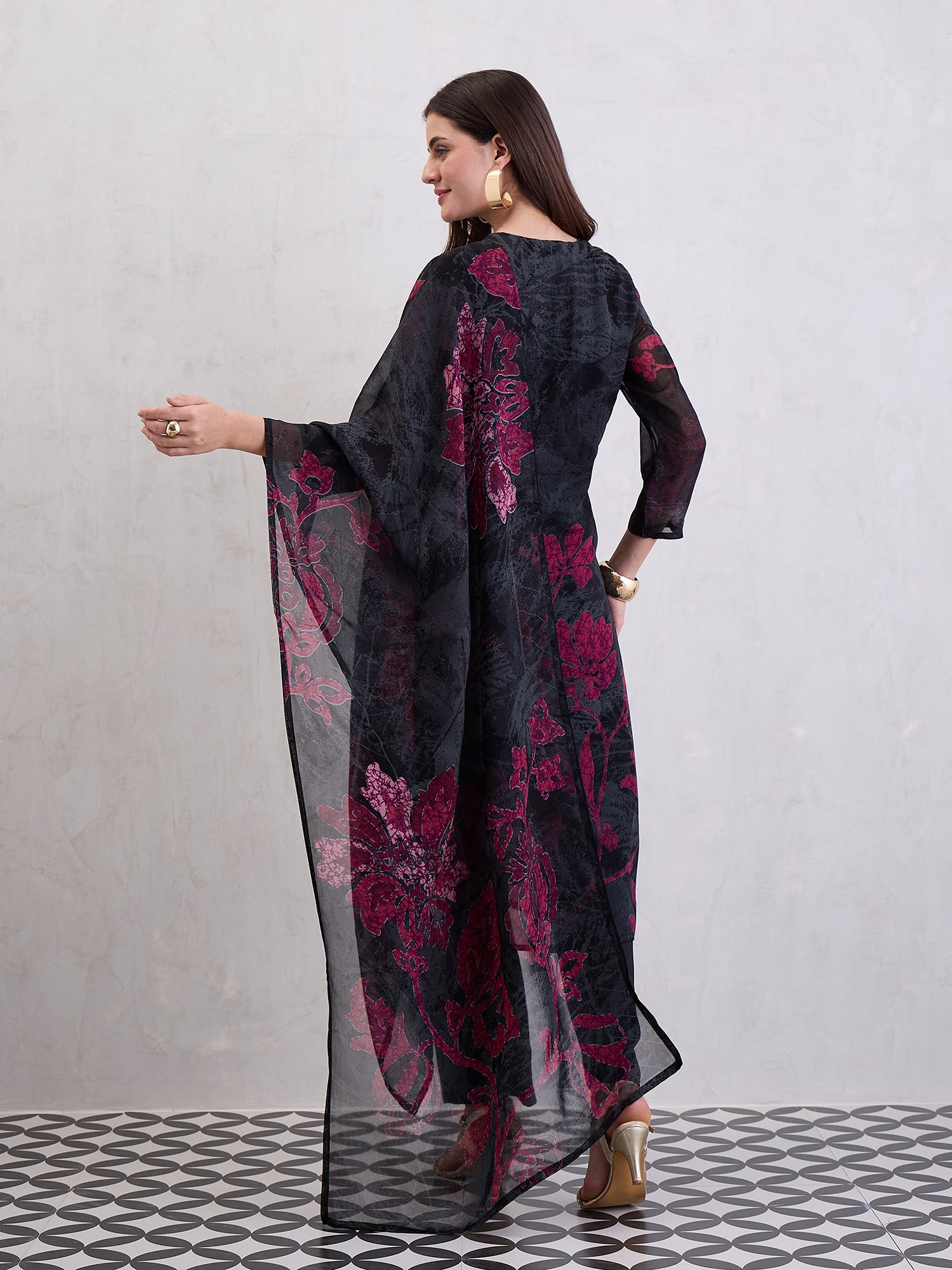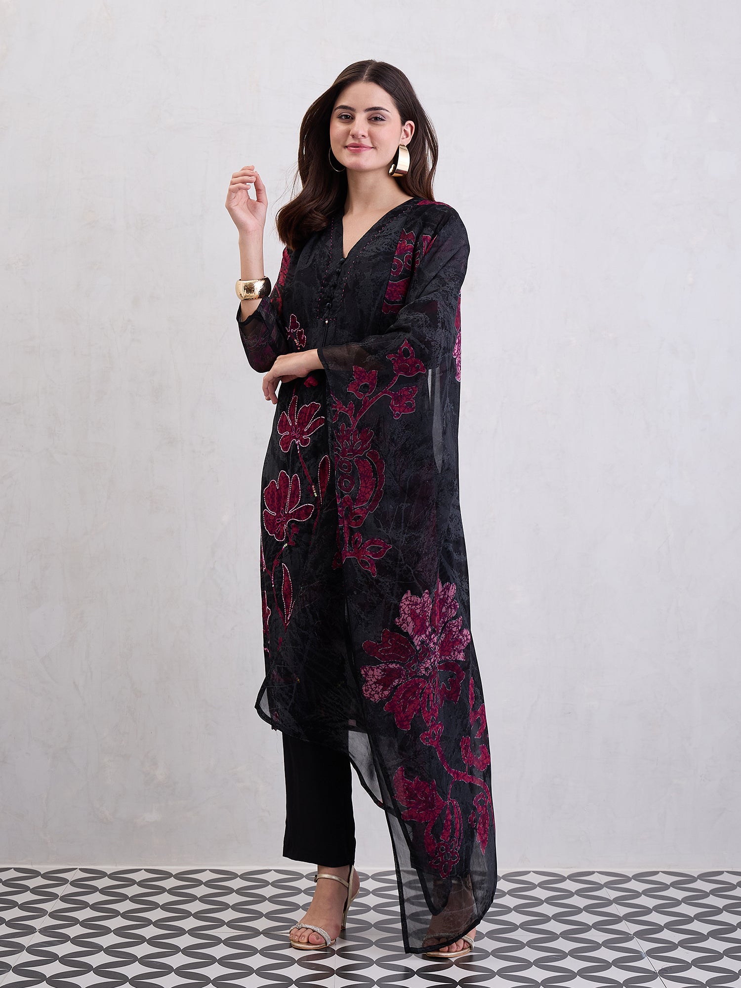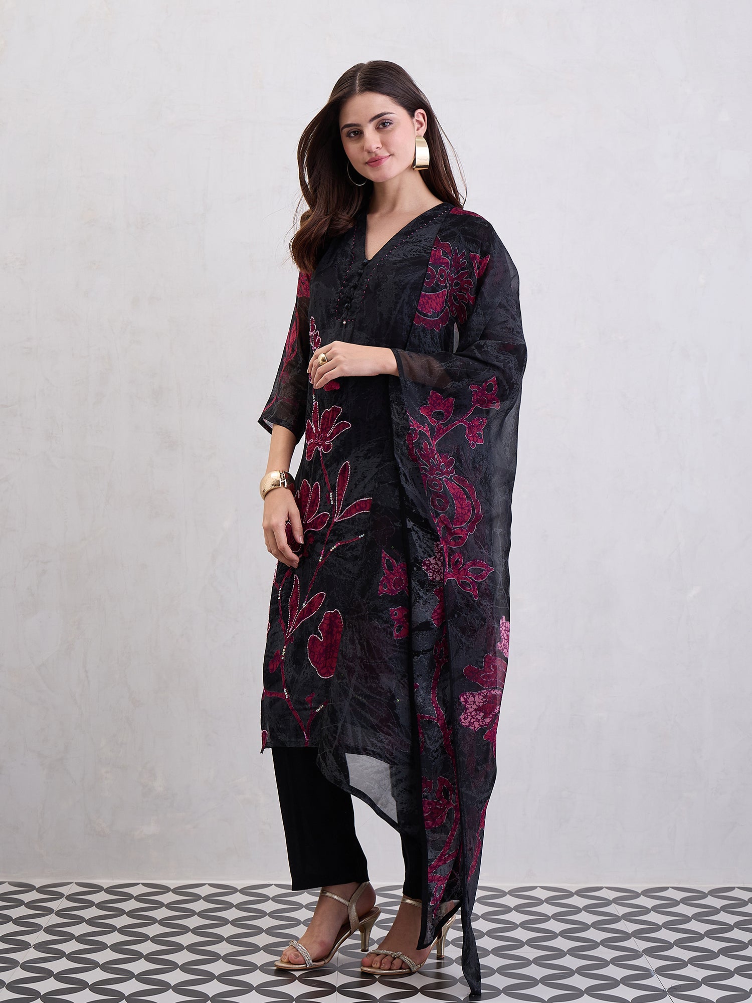 Floral Printed Beads and Stones Organza Straight Kurta With Trousers & Dupatta