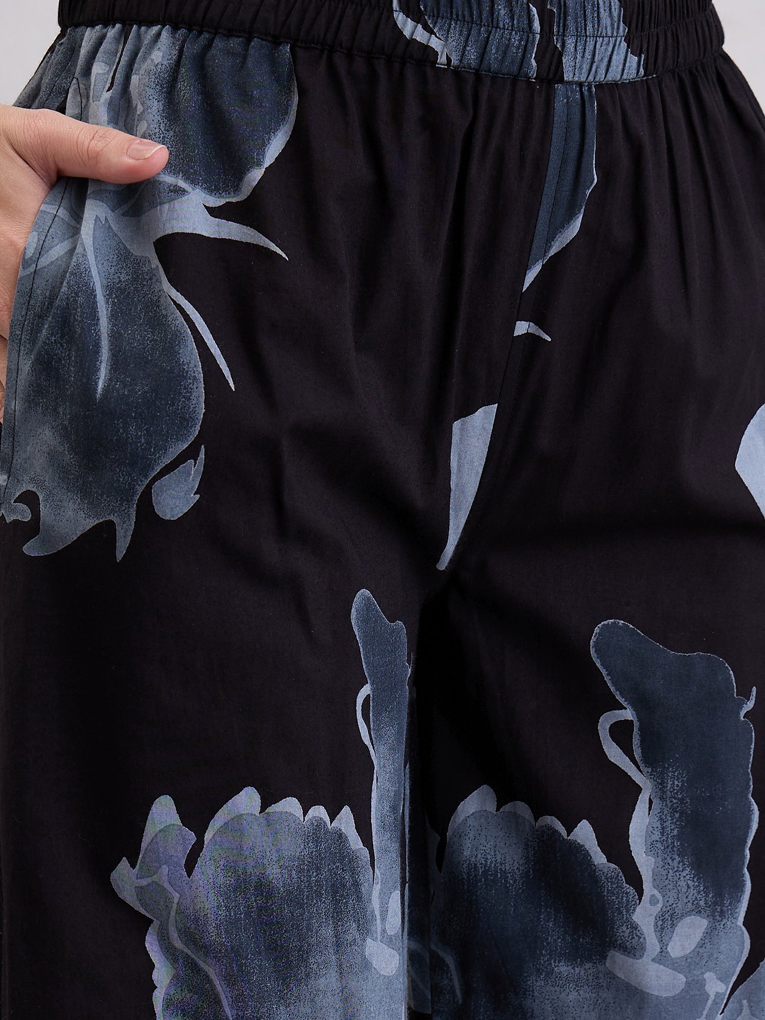 Black and grey floral printed trousers, has an elasticated waistband with slip-on closure