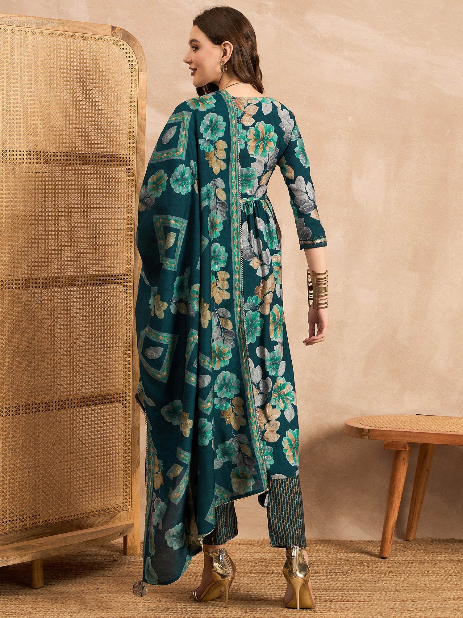Green, turquoise blue and brown printed Kurta with Trousers & dupatta