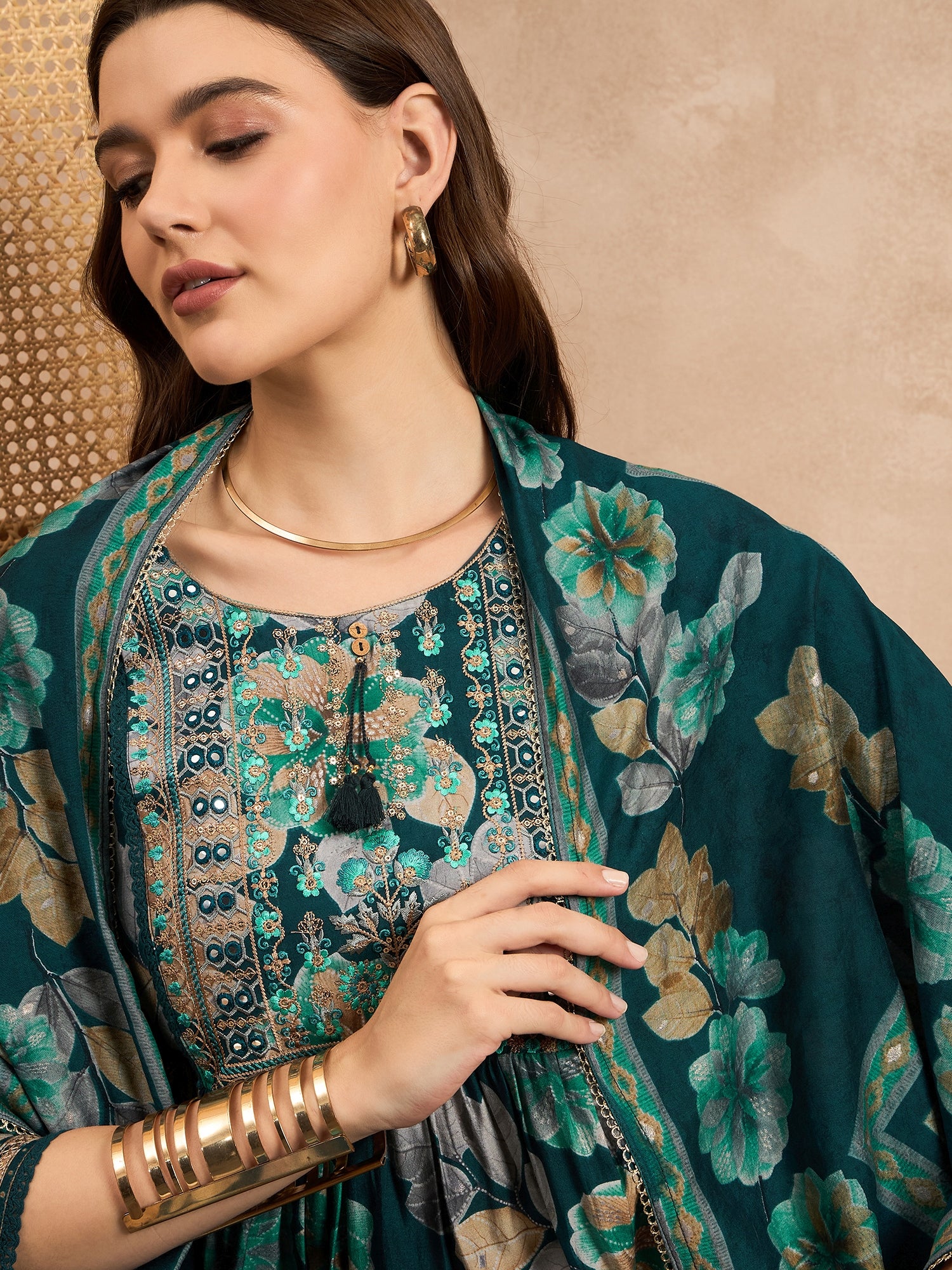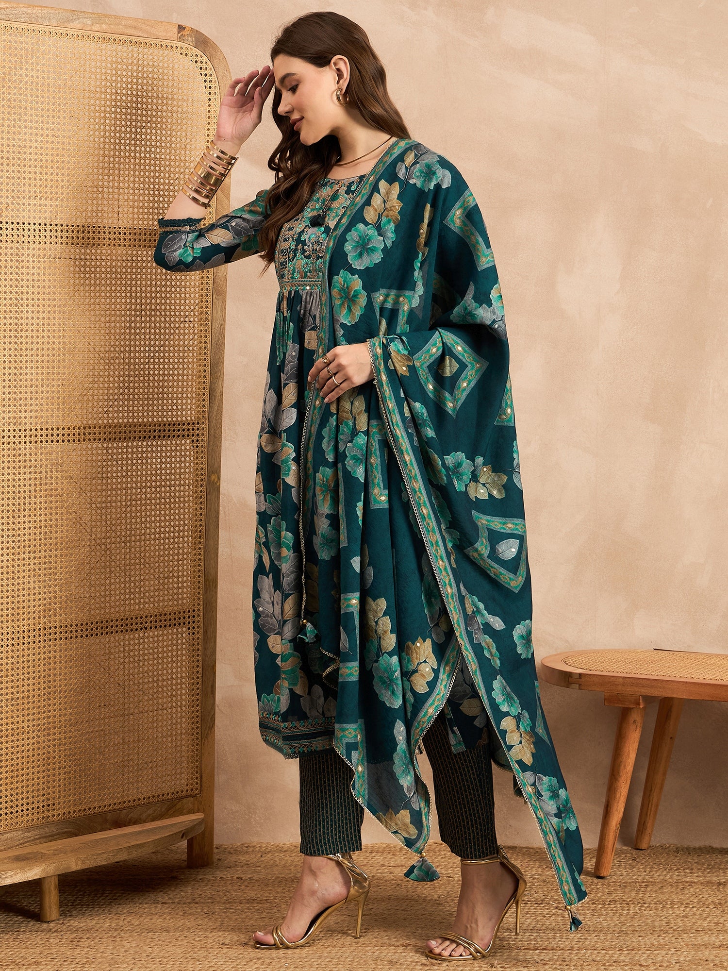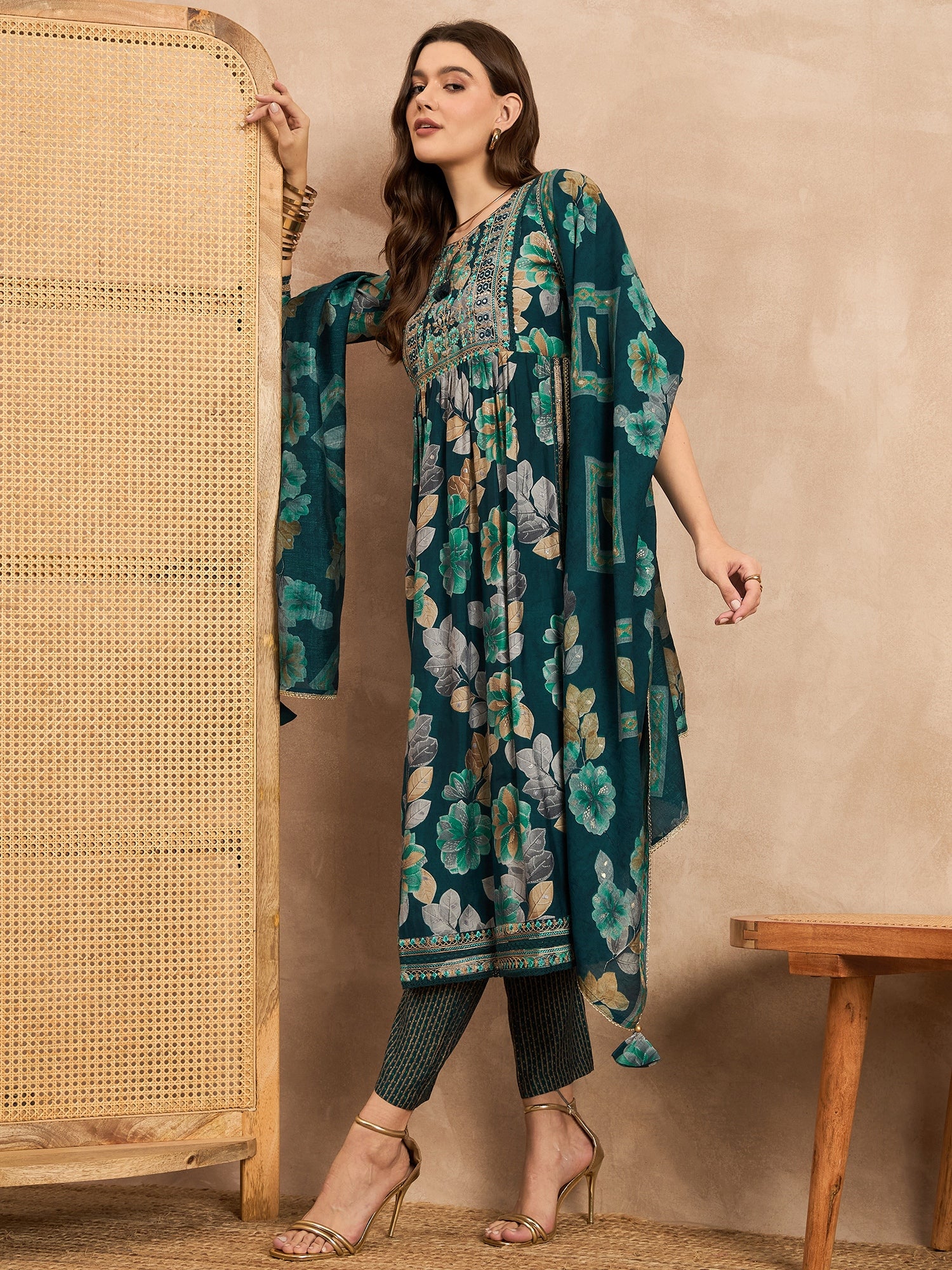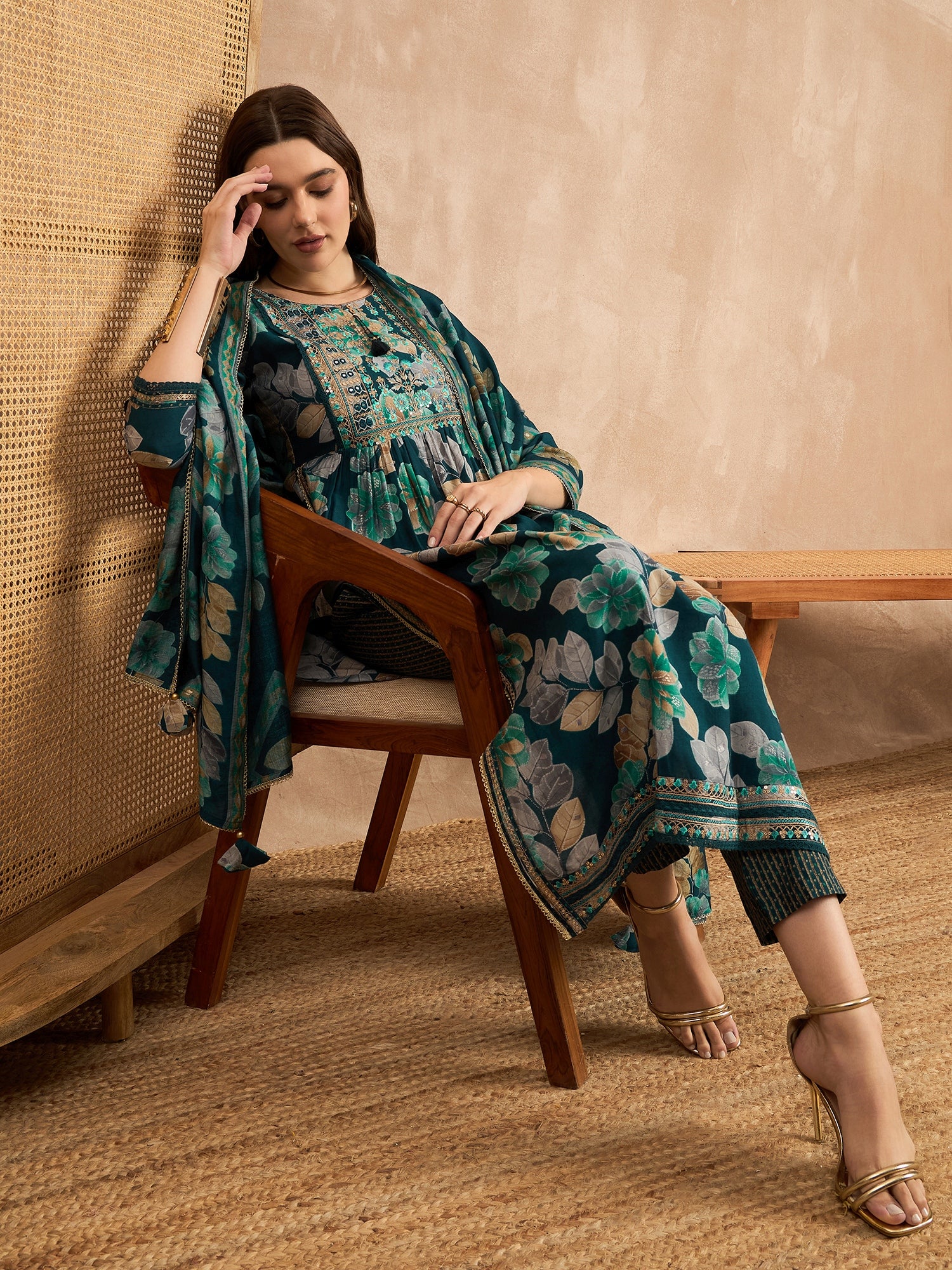 Floral Printed Mirror Work Pleated Chanderi Silk A-Line Kurta With Trouser & Dupatta