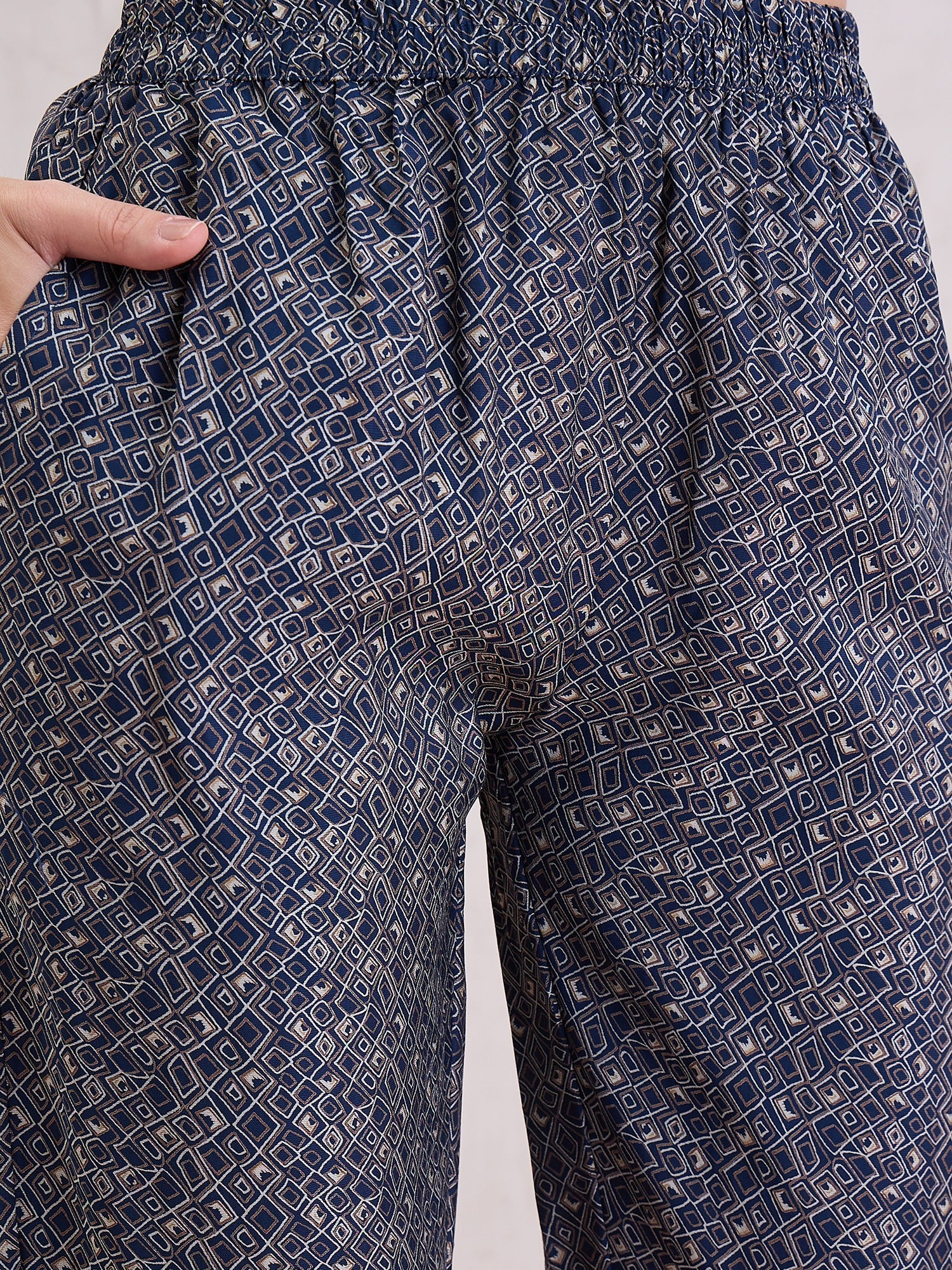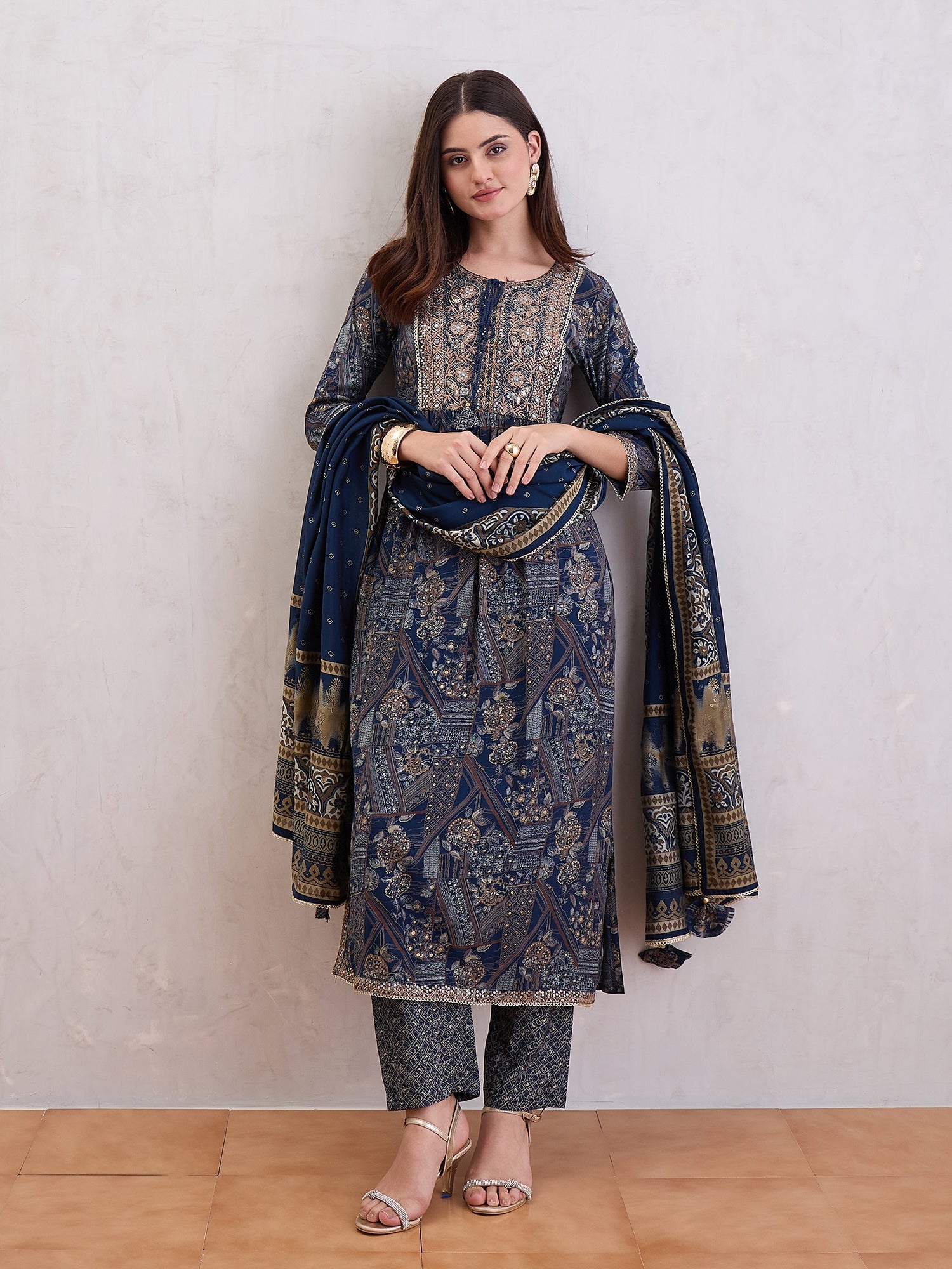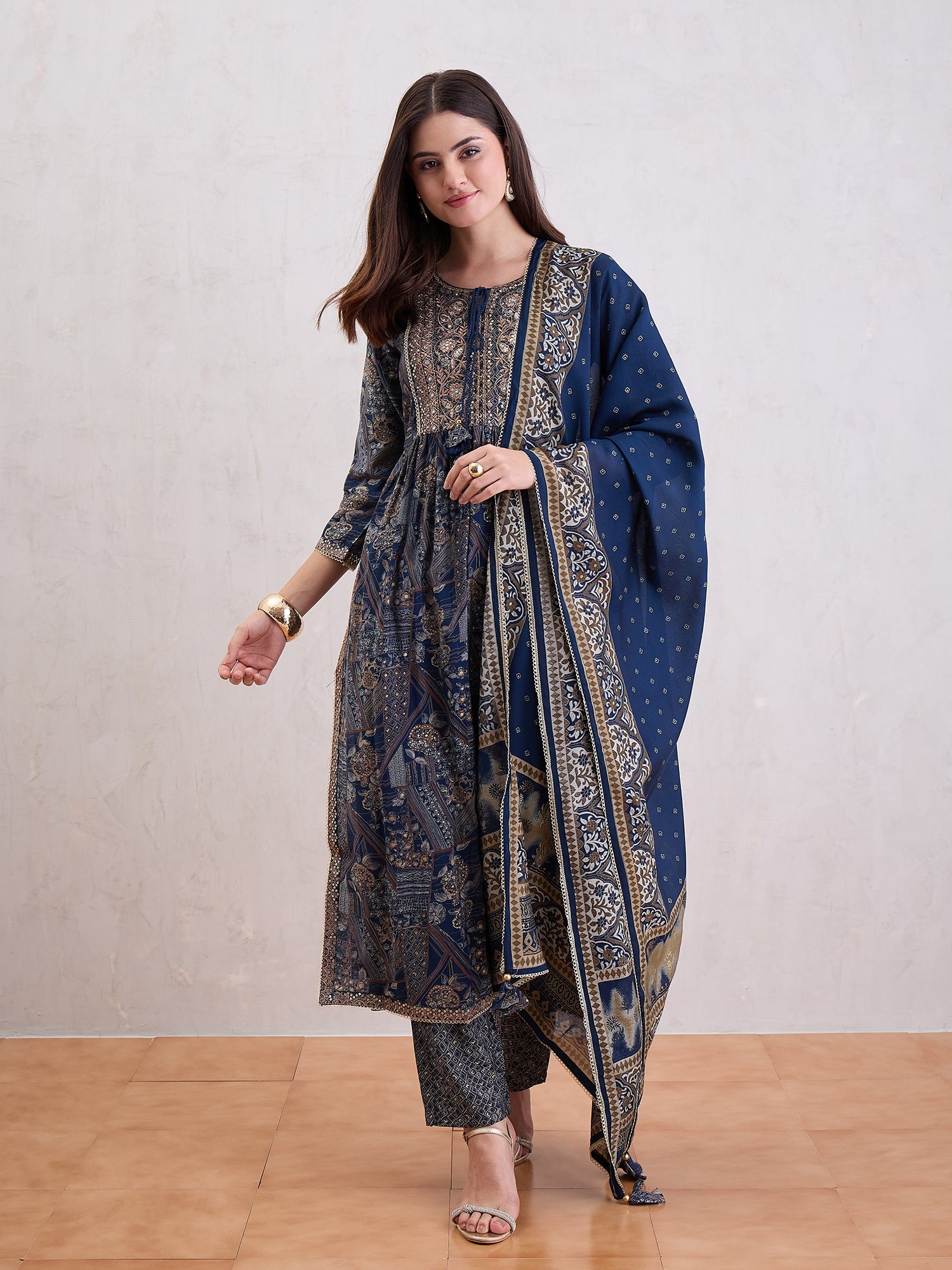 Blue, white and brown embroidered Kurti with Trousers & dupatta