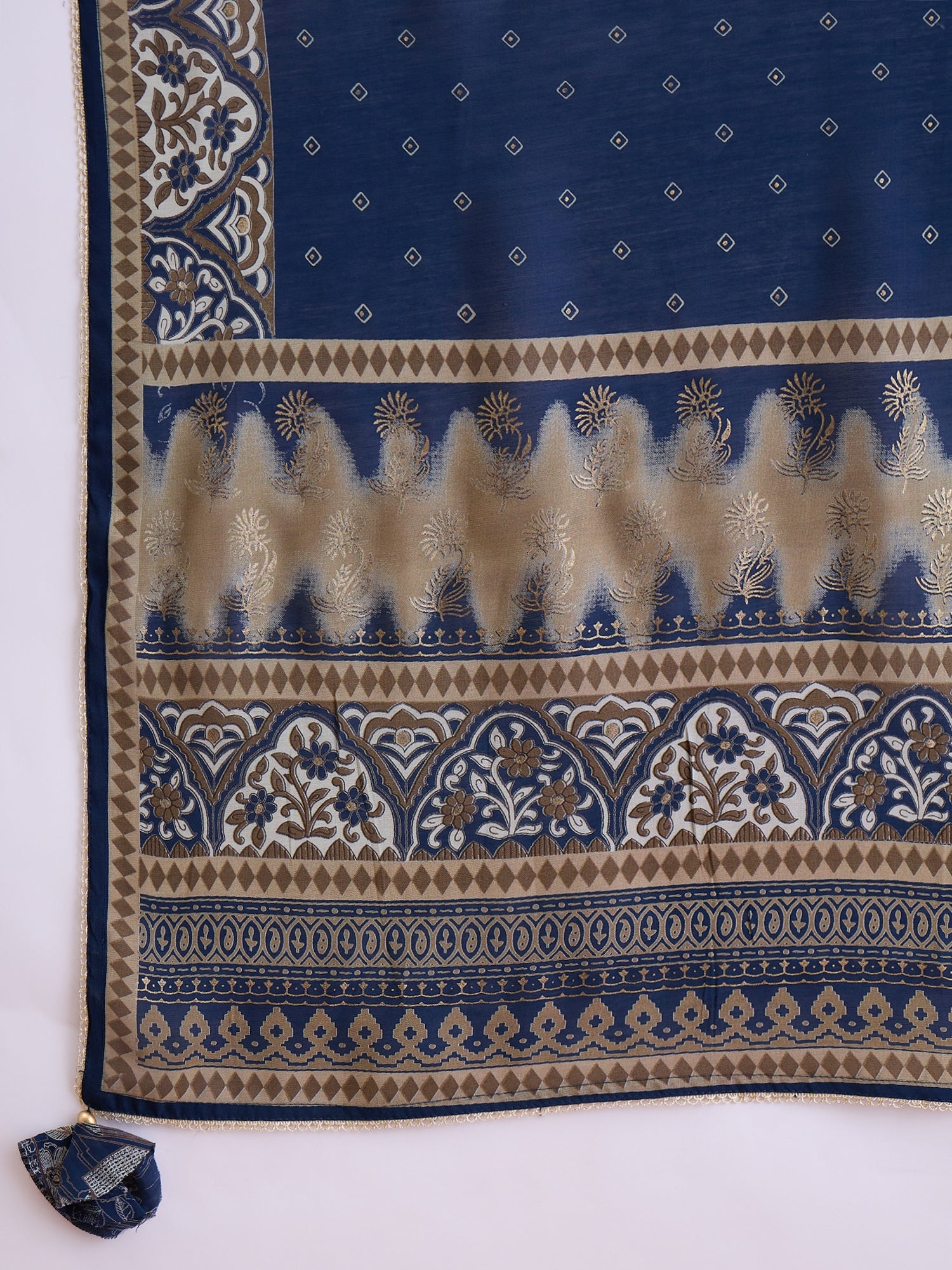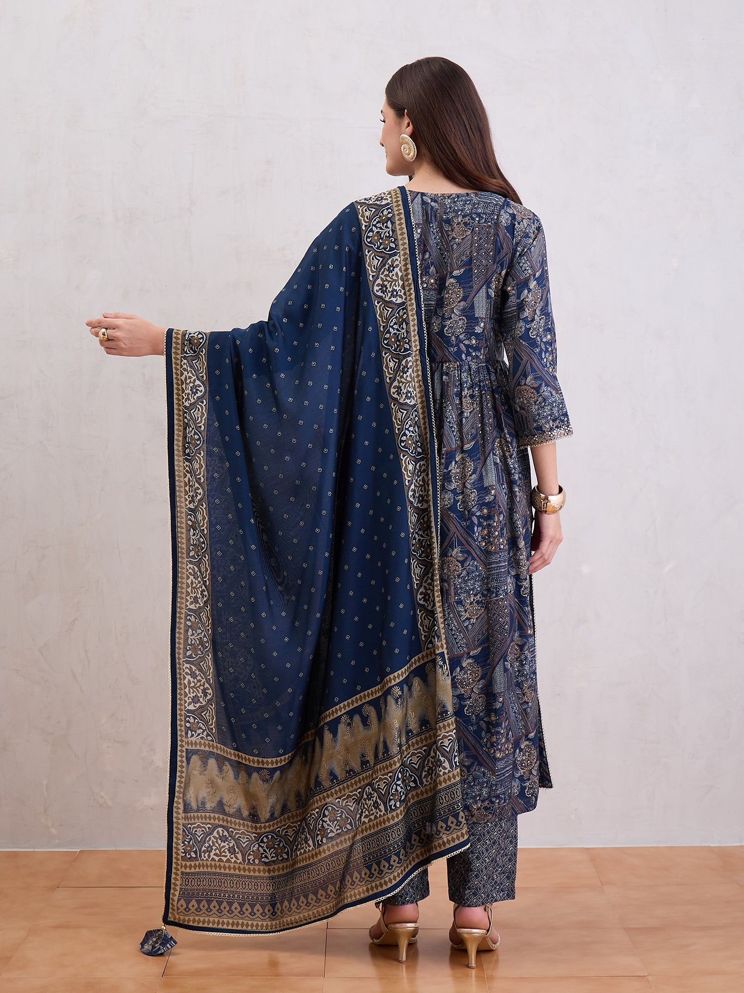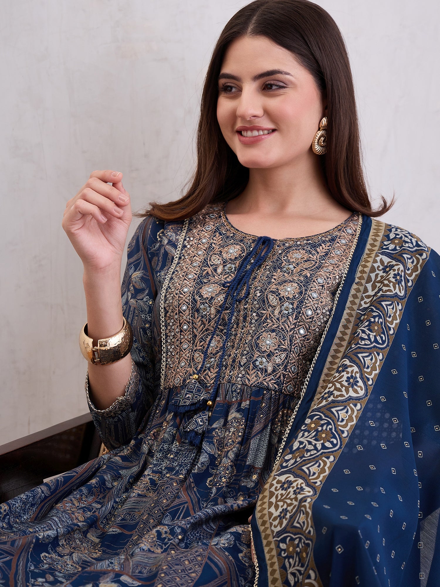 Floral Printed Pleated Mirror Work Chanderi Silk Kurta With Trousers & Dupatta