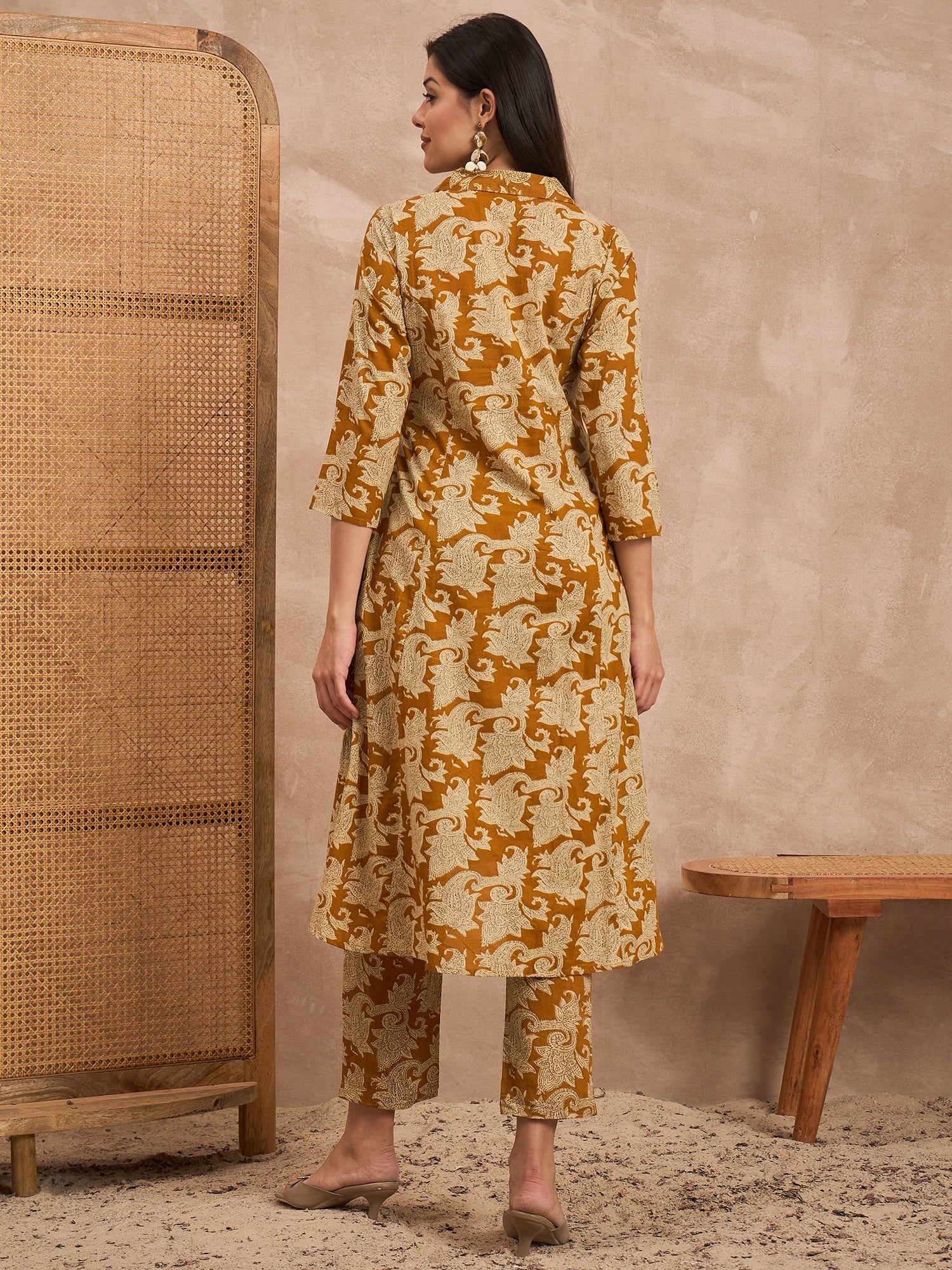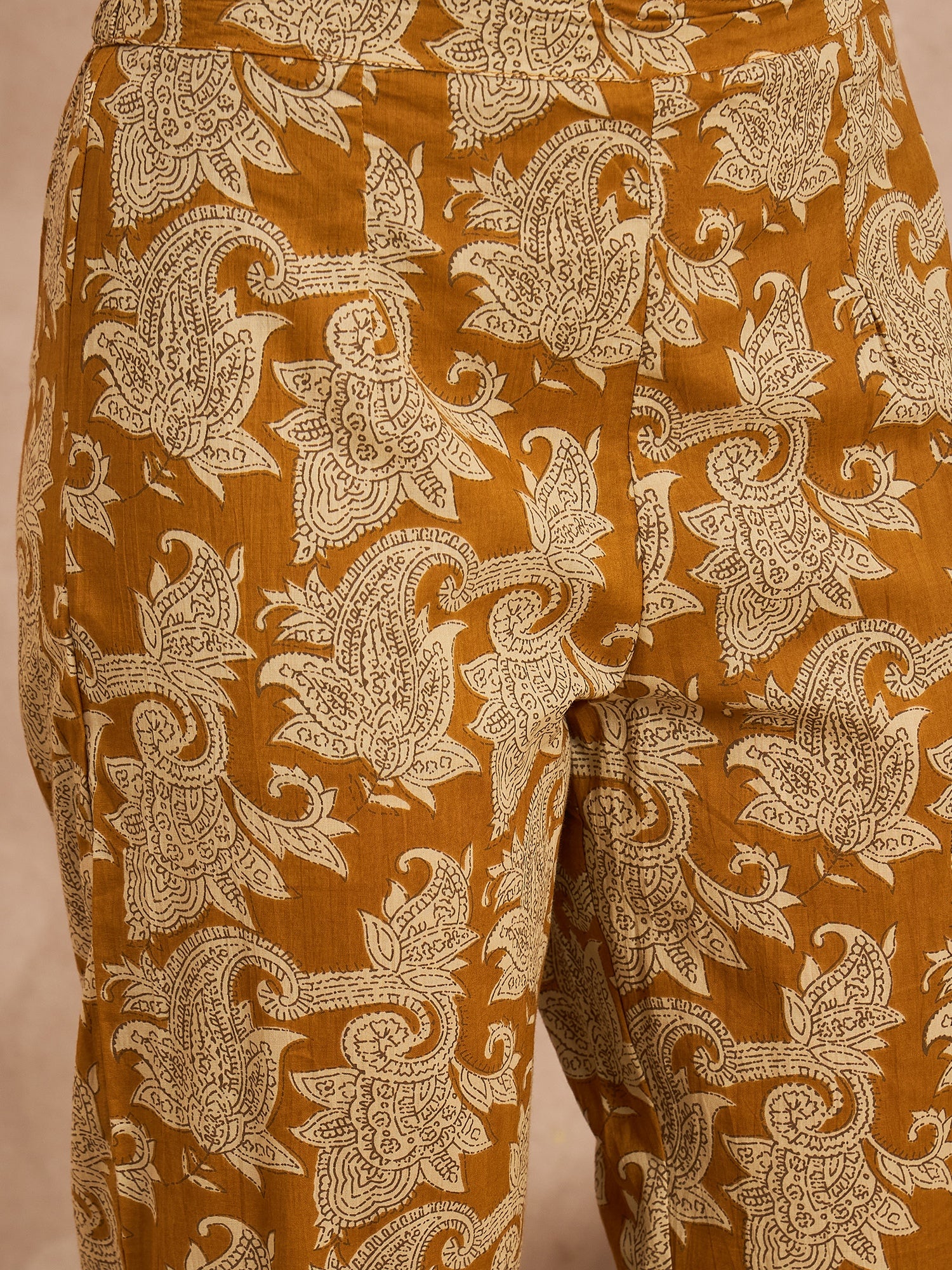Mustard and white floral printed trousers, has an elasticated waistband with slip-on closure
