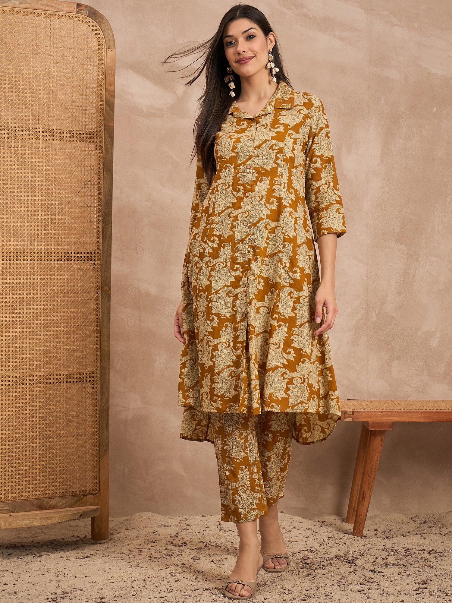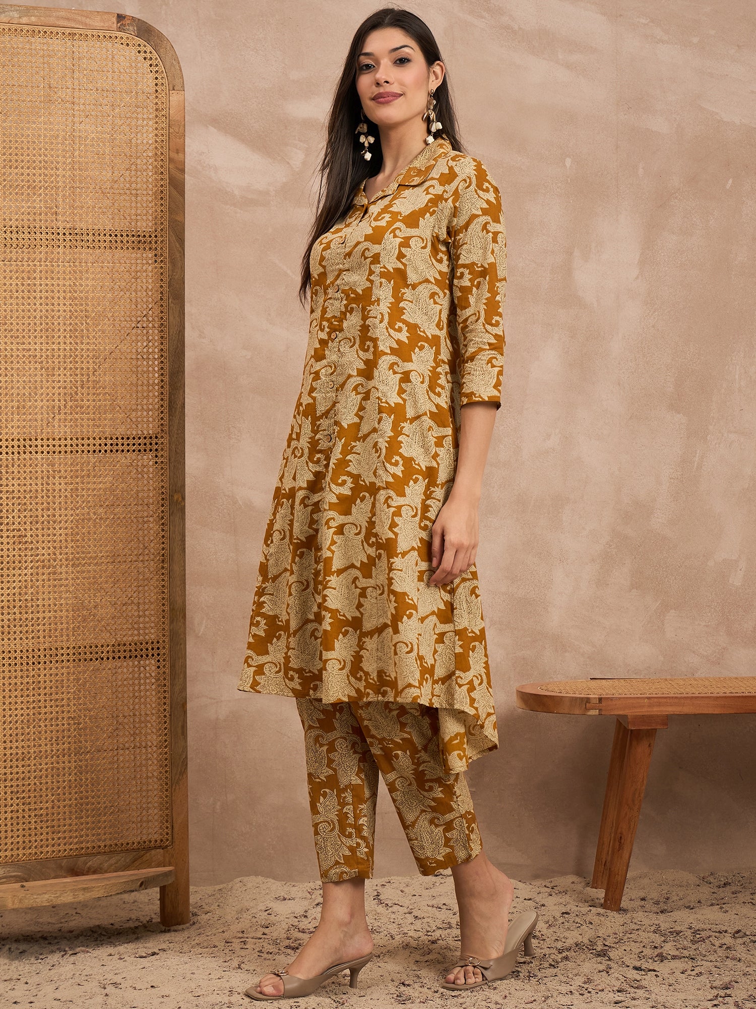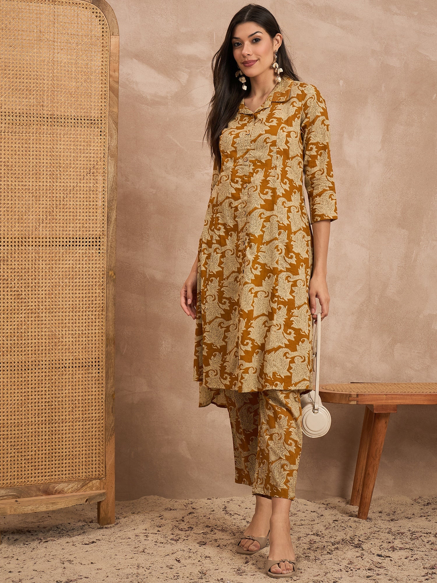 Mustard and white floral printed tunic, has shirt collar neck and three quarter sleeves and 1 pocket