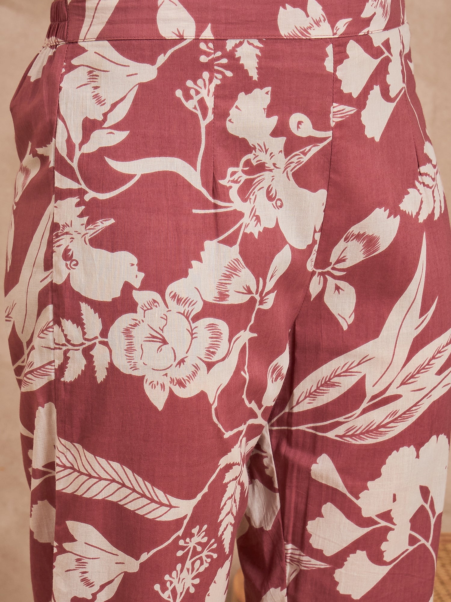 Pink and white floral printed trousers, has an elasticated waistband with slip-on closure