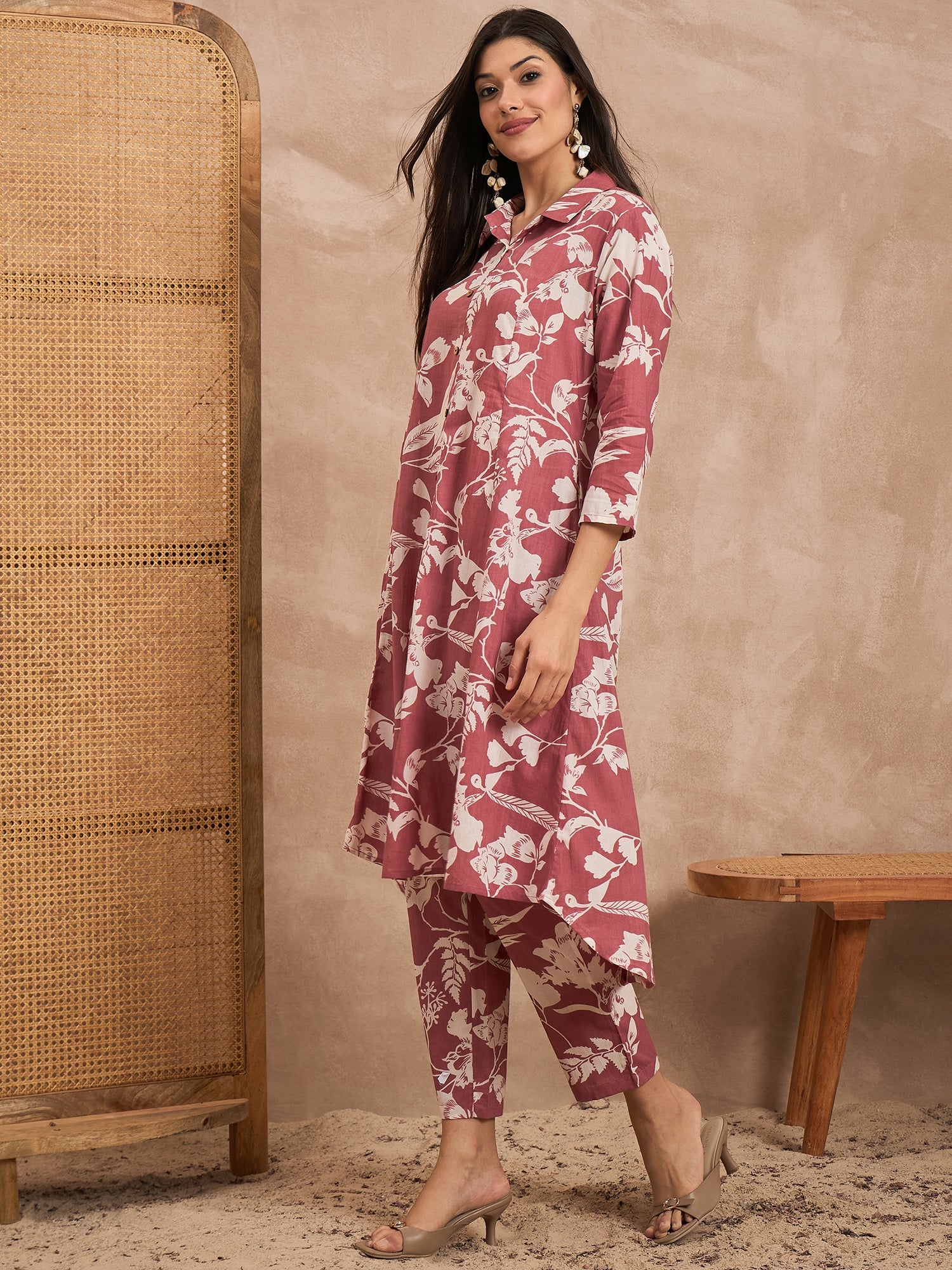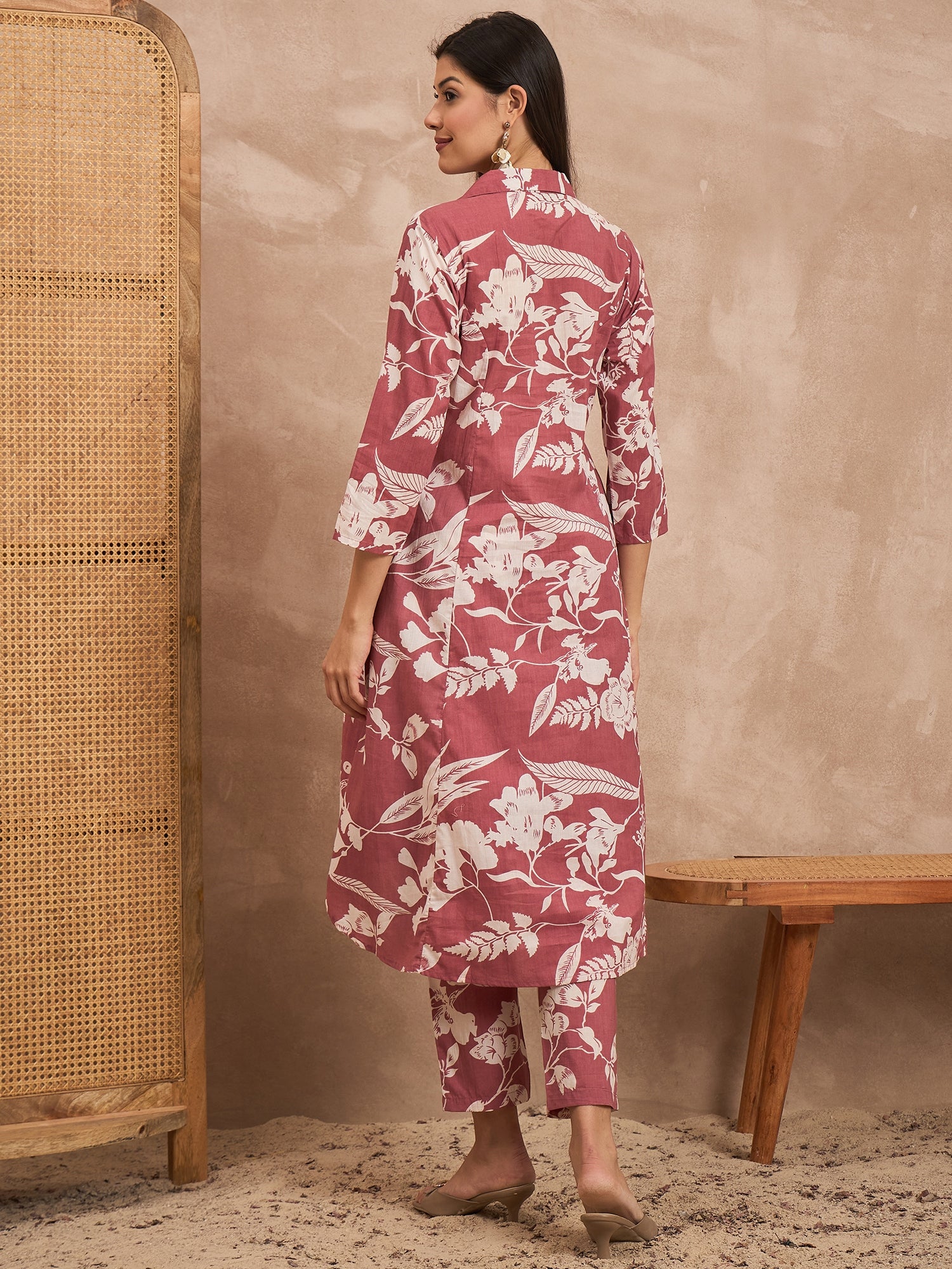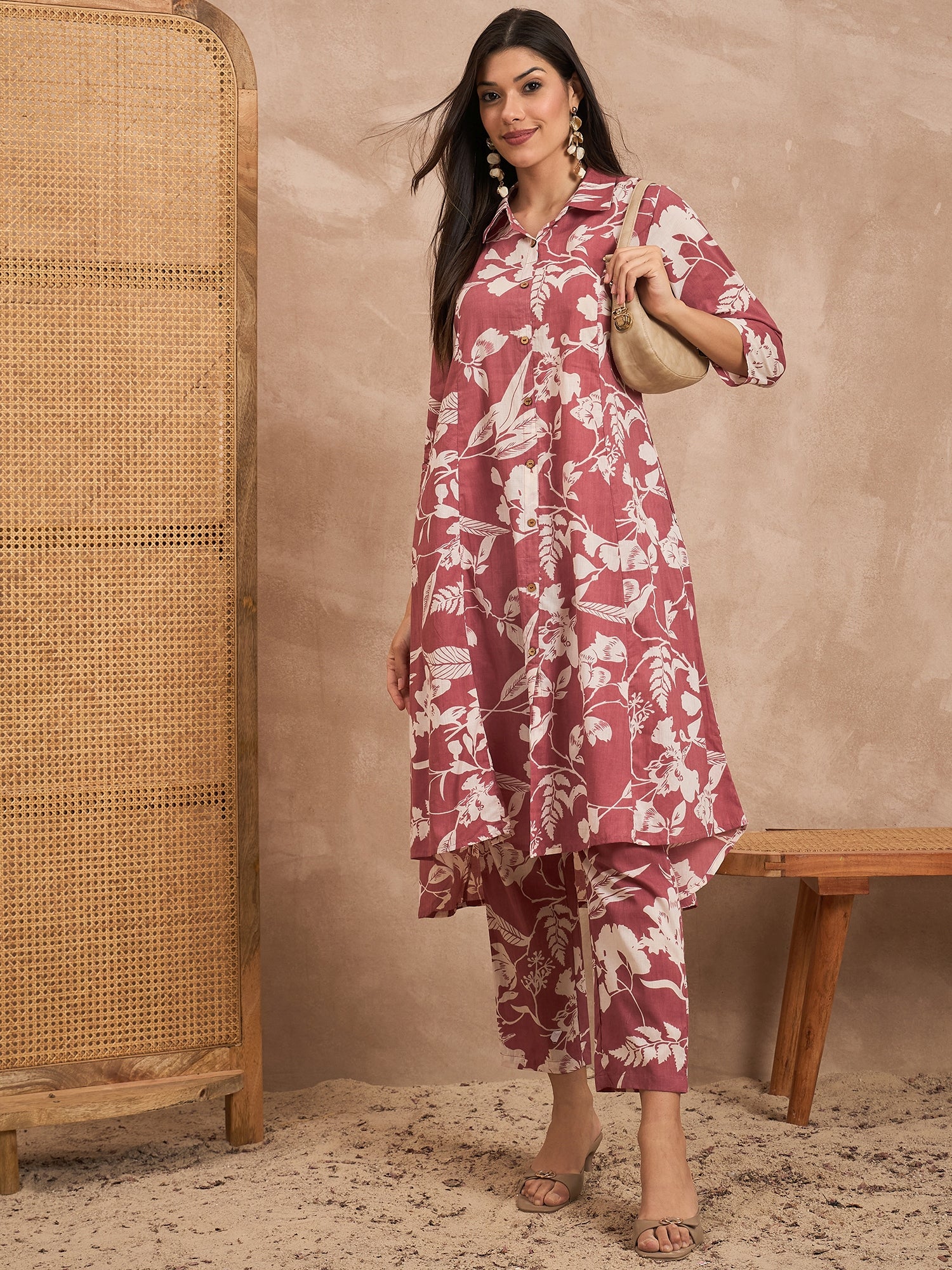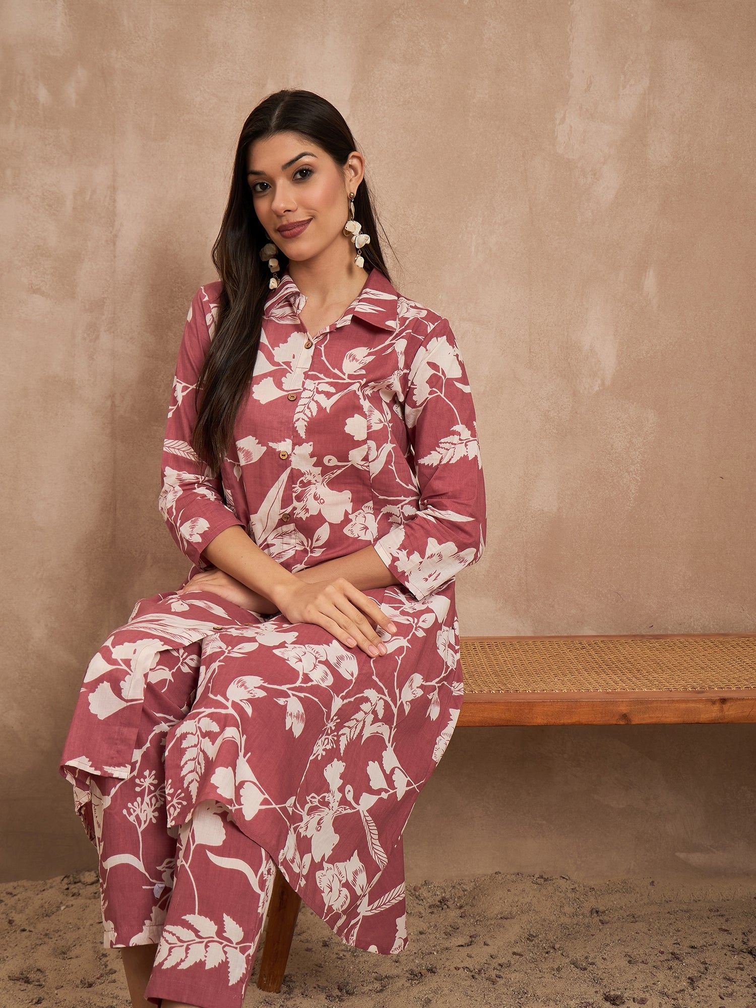 Pink and white floral printed tunic, has shirt collar neck and three quarter sleeves and 1 pocket